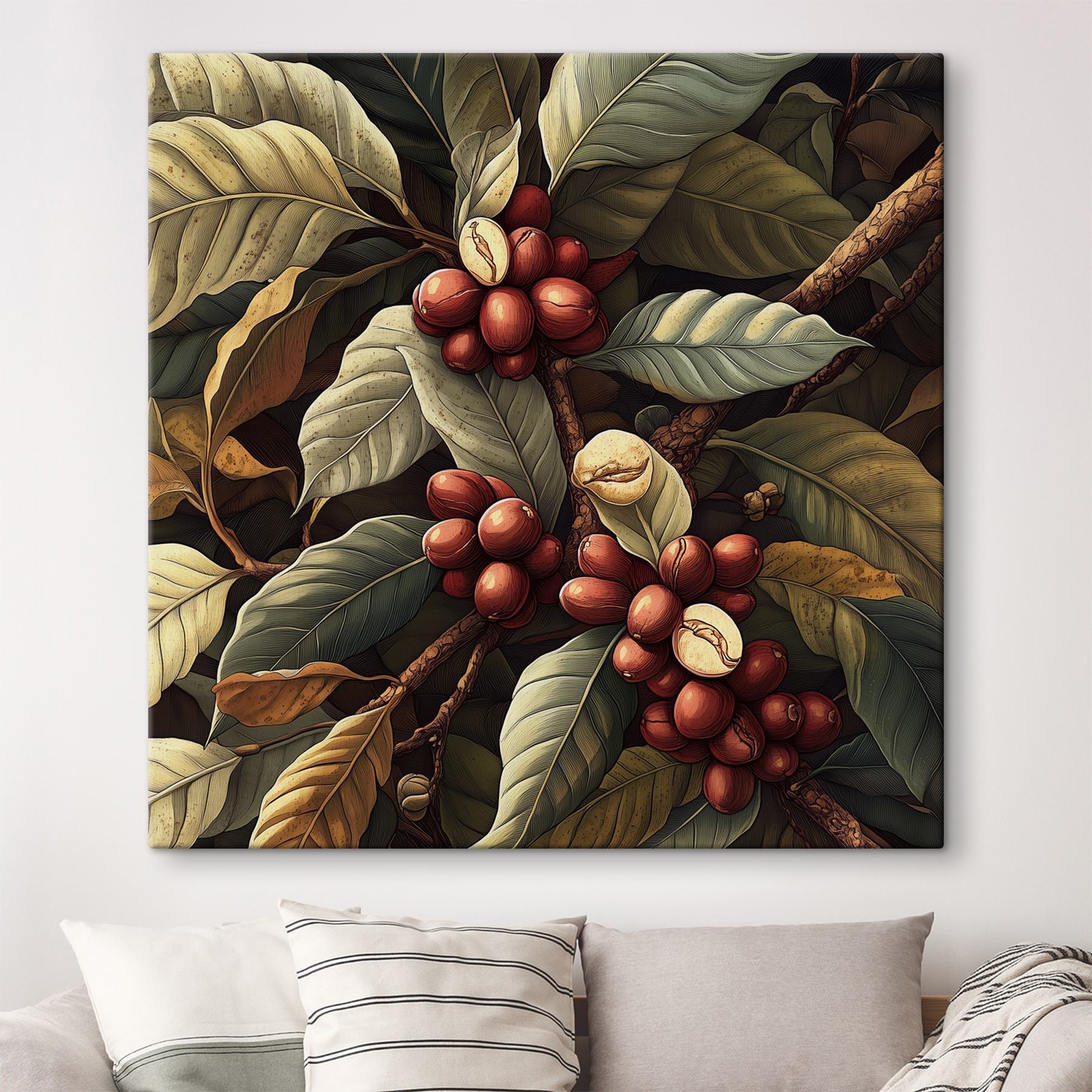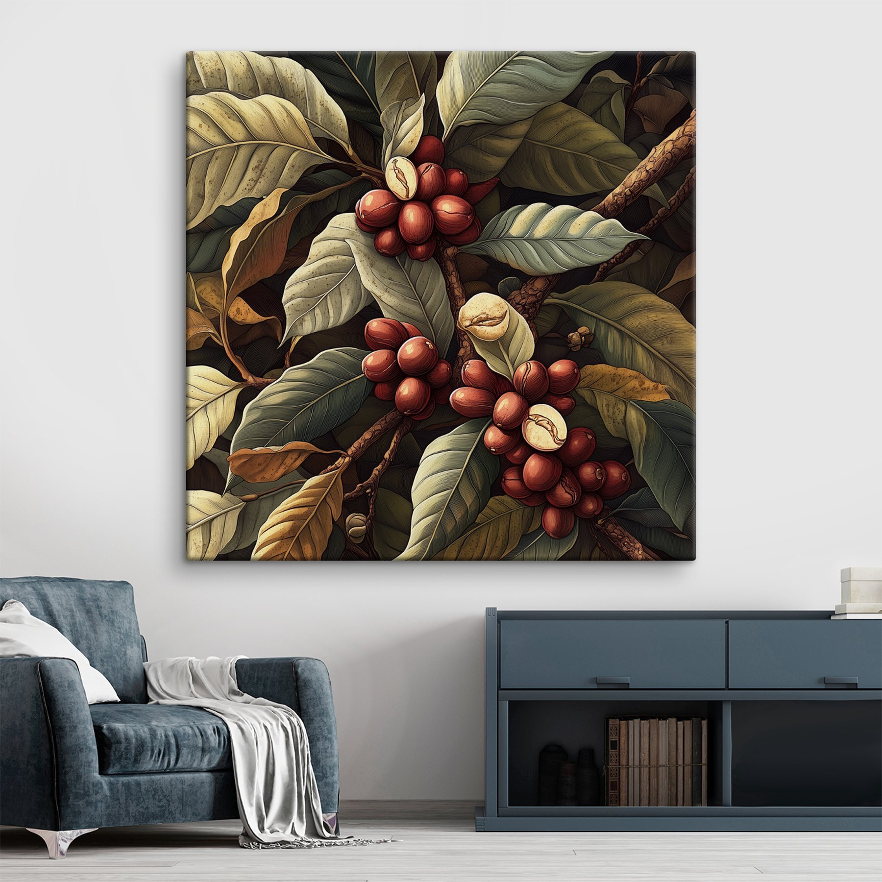 Odmień swoją przestrzeń dzięki temu wspaniałemu obrazowi na płótnie zatytułowanemu “Fresh Coffee Berries on Leafy Branches”. Wyobraź sobie, że budzisz się w otoczeniu bogatych kolorów, przypominających przytulną kawiarnię. Każdy szczegół, od żywych jagód po bujne liście, przenosi naturę prosto do Twojego domu. To jak posiadanie małego kawałka plantacji kawy, bez latających wszędzie ziaren! Idealna do kuchni lub spokojnego zakątka, ta grafika wywołuje spokojną, zachęcającą atmosferę. Znajomi mogą po prostu zapytać, gdzie znalazłeś tak przyciągający wzrok element. Kto nie chciałby codziennego przypomnienia o pięknie natury i ukłonu w stronę ukochanego rytuału picia kawy?