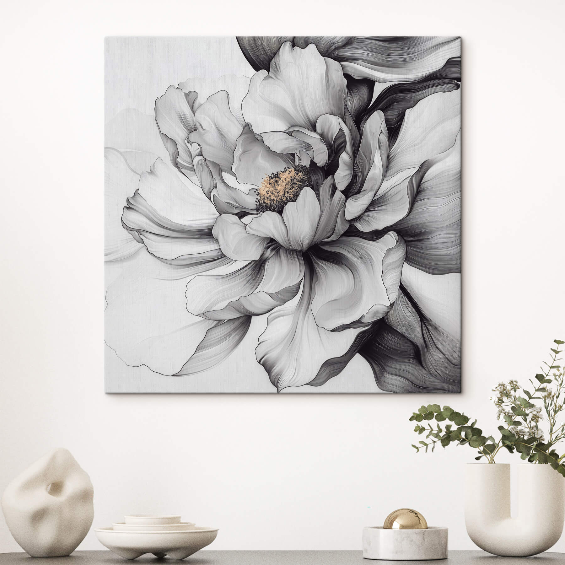 Poznaj “Delicate Petals in Monochrome Hues” – wydruk na płótnie, który otuli Twoją przestrzeń kojącym uściskiem elegancji. Wyobraź sobie cichy zakątek, może z wygodnym fotelem i filiżanką herbaty, gdzie ta oszałamiająca kwiatowa sztuka bez wysiłku dodaje uroku. Misterne linie i delikatne odcienie zachęcają do odkrywania każdego płatka, wywołując marzenia o spokojnych ogrodach. To sztuka, która szepcze elegancję bez krzyku. Idealny dla tych, którzy cenią piękno w prostocie, ten kawałek może po prostu zainspirować lepsze dni i przytulne noce. Kto by pomyślał, że kwiaty mogą być tak fantazyjne, a jednocześnie tak wyluzowane?