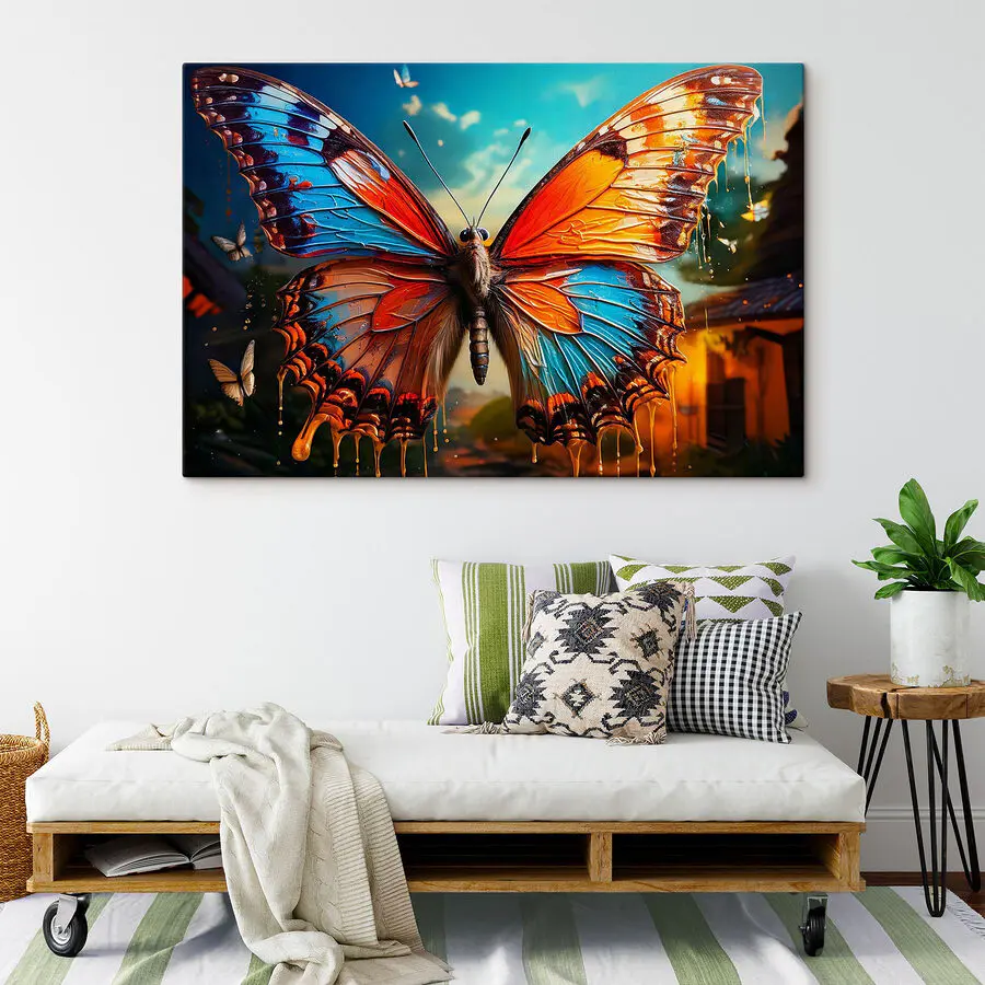 Wyobraź sobie ten wspaniały wydruk na płótnie przedstawiający motyla z pomarańczowymi i niebieskimi skrzydłami tańczącego w Twojej przestrzeni. To jak posiadanie kawałka magii natury bezpośrednio na ścianie. Kolory rzucają się w oczy, sprawiając, że trudno oderwać od niego wzrok – kto nie poczułby się szczęśliwszy, mając go w zasięgu wzroku? Idealny do przytulnego kącika do czytania, a może nawet nad tętniącą życiem jadalnią, wnosi ciepło i odrobinę kaprysu. Goście mogą się uśmiechnąć, uderzeni pięknem – może nawet wspominając późne letnie popołudnia. To nie tylko sztuka; to małe przypomnienie o blasku natury.