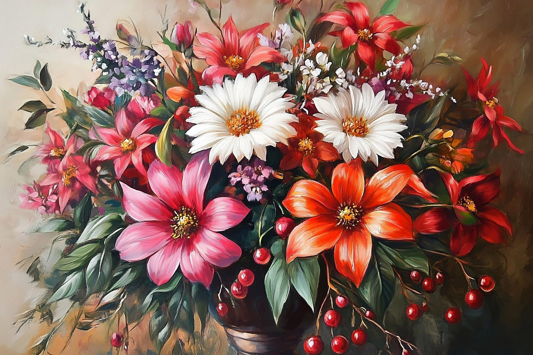 Przedstawiamy żywy wydruk na płótnie, który z pewnością rozjaśni każdą przestrzeń – wyobraź sobie bukiet kwiatów, tętniący życiem i kolorami, tylko dla Twojej ściany. “Obraz Painting of Flowers in a Vase” prezentuje żywą mieszankę czerwieni, różu i bieli, oddając urok natury niczym ciepły uścisk.
