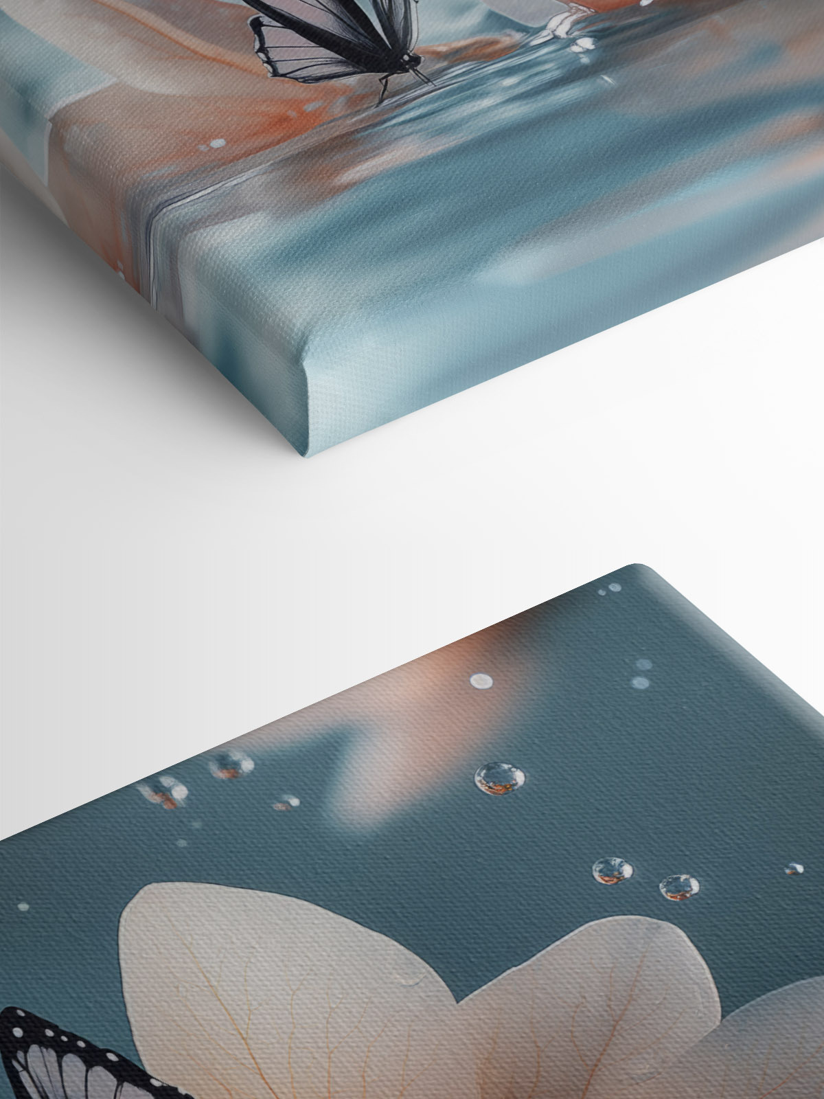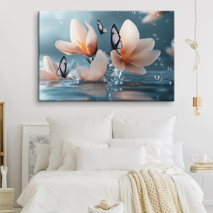 Rozjaśnij każdą przestrzeń dzięki temu czarującemu obrazowi na płótnie “Motyle na kwiatach i wodzie”. Wyobraź sobie, że wchodzisz do pokoju i witają Cię delikatne motyle tańczące nad miękkimi kwiatami – spokojna ucieczka wprost na Twoją ścianę. Delikatne błękity i delikatne róże tworzą uspokajającą atmosferę, idealną do przytulnego kącika do czytania lub tej pustej ściany, która denerwuje Cię od wieków. To jak przeniesienie małego kawałka natury do wnętrza, wodny blask i wszystko inne. Kto nie uśmiechnąłby się popijając kawę obok tej pięknej grafiki? To słodkie przypomnienie o pięknie w małych chwilach, pozostawiając każdego gościa nieco bardziej oczarowanego.