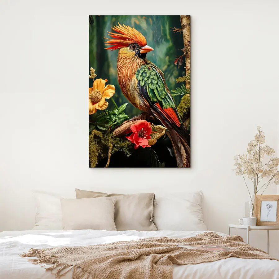 Wnieś odrobinę natury do wnętrza dzięki temu żywemu drukowi na płótnie, przedstawiającemu kolorowego ptaka siedzącego na gałęzi. To jak mały tropikalny wypad prosto do salonu! Odważne odcienie ptasich piór tańczą pośród delikatnych kwiatów, tworząc żywą scenę, która wywoła uśmiech na twarzy każdego. Wyobraź sobie, że popijasz poranną kawę, podczas gdy ten wesoły ptaszek wpatruje się w ciebie, zachęcając do chwytania dnia. Idealna dla miłośników zwierząt lub każdego, kto pragnie odrobiny dzikiej natury – ta grafika dodaje ciepłej, zachęcającej atmosfery, która z pewnością rozjaśni każdą przestrzeń.