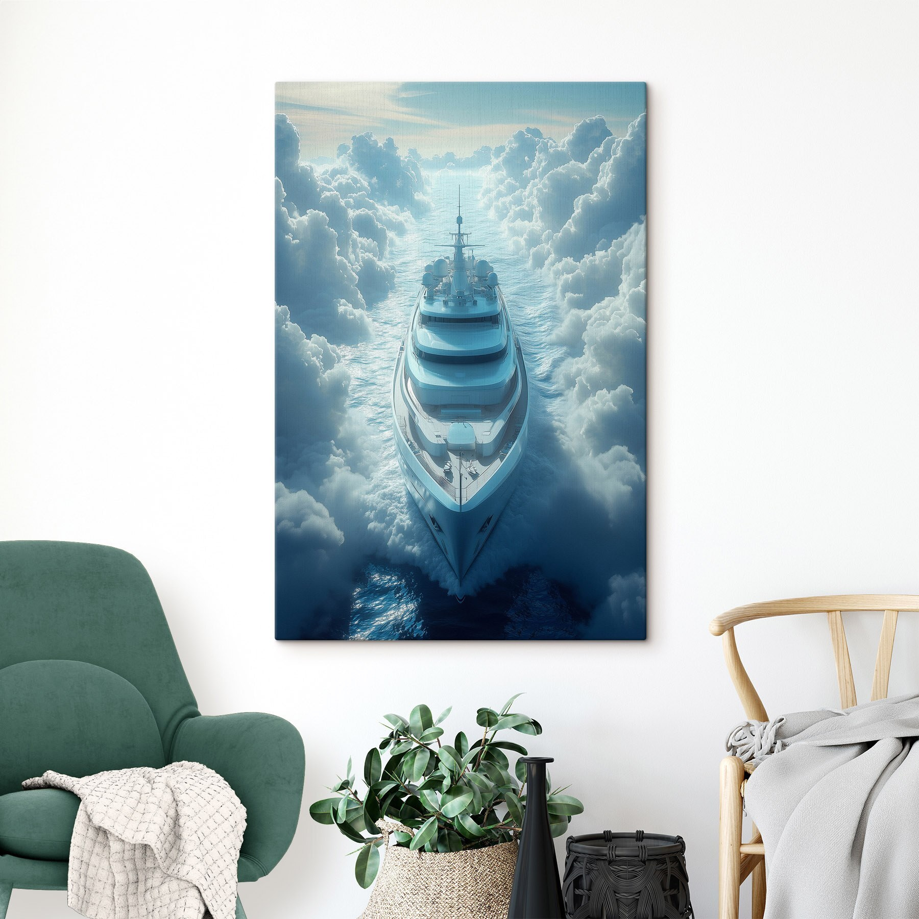 Odpłyń w senną ucieczkę z “Obraz Ship in the Clouds”. Ten oszałamiający obraz przedstawia majestatyczny jacht szybujący wśród kłębiastych chmur, jakby był na tajnej przygodzie. Wyobraź sobie, że wisi w salonie lub przytulnym gabinecie, gdzie każde spojrzenie przenosi cię do świata spokoju. Delikatne błękity i marzycielskie biele tworzą spokojną atmosferę – idealną do marzeń na jawie lub rozmów. To tak, jakby mieć kawałek oceanu w domu, gdzie morze spotyka się z niebem. Kto nie poczułby się bardziej odważny w tak inspirującym otoczeniu?