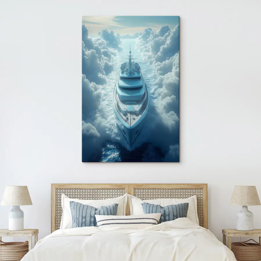 Odpłyń w senną ucieczkę z “Obraz Ship in the Clouds”. Ten oszałamiający obraz przedstawia majestatyczny jacht szybujący wśród kłębiastych chmur, jakby był na tajnej przygodzie. Wyobraź sobie, że wisi w salonie lub przytulnym gabinecie, gdzie każde spojrzenie przenosi cię do świata spokoju. Delikatne błękity i marzycielskie biele tworzą spokojną atmosferę – idealną do marzeń na jawie lub rozmów. To tak, jakby mieć kawałek oceanu w domu, gdzie morze spotyka się z niebem. Kto nie poczułby się bardziej odważny w tak inspirującym otoczeniu?