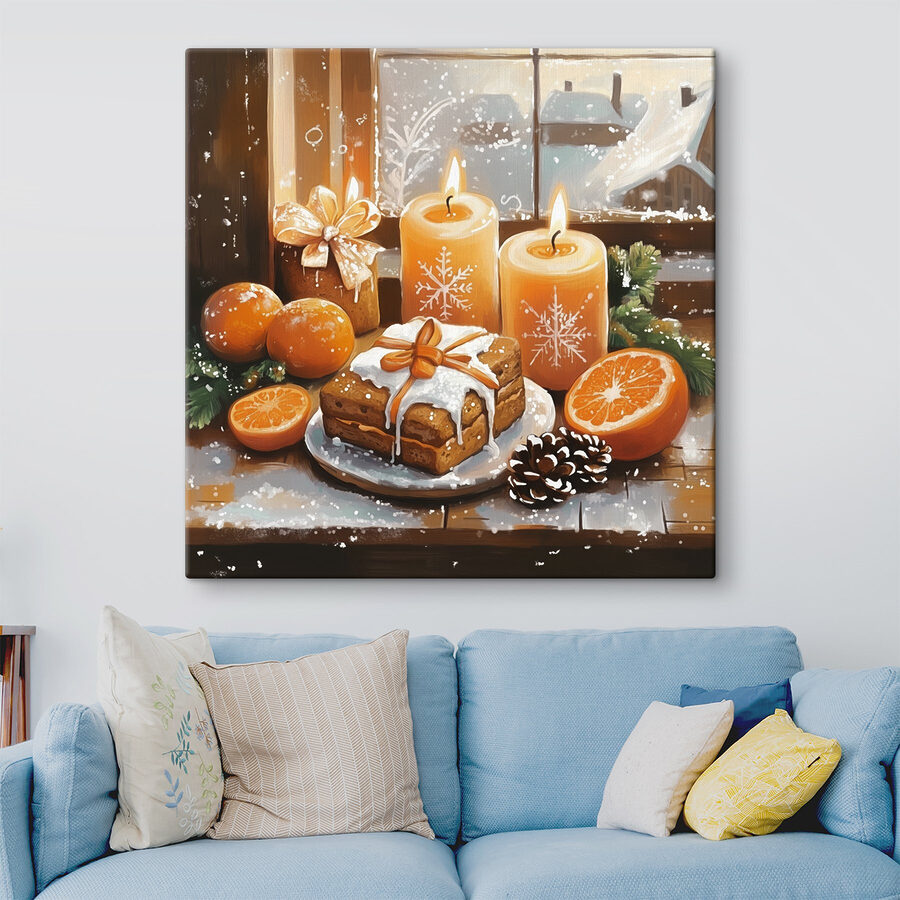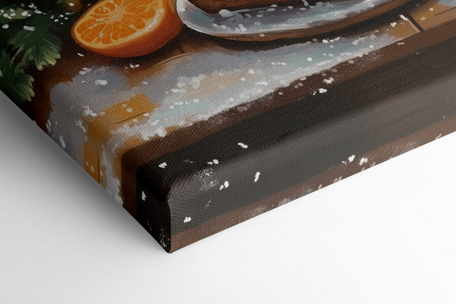 Przekształć dowolną przestrzeń w przytulne miejsce dzięki temu czarującemu wydrukowi na płótnie. Zatytułowany “Food and Candles on a Table”, oddaje idealny zimowy klimat – migoczące ciepłe świece, słodkie smakołyki czekające na skosztowanie i aromat przypraw tańczący w powietrzu. Wyobraź sobie, że popijasz kakao przy ognisku, spoglądasz na tę piękną scenę i od razu czujesz się zrelaksowany. To jak rozkoszna pogawędka z przyjaciółmi bez słowa. A te pomarańcze? Feeria barw, która po prostu zachęca do uśmiechu. Idealny do kuchni, jadalni lub wszędzie tam, gdzie chcesz wywołać radość i komfort. Subtelne przypomnienie, że czasami to proste rzeczy, takie jak dobre jedzenie i ciepłe świece, sprawiają, że życie jest takie słodkie.