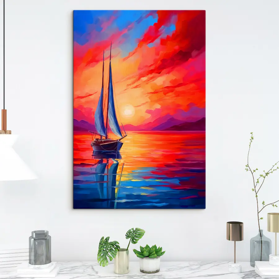 Wyobraź sobie, że wchodzisz do pokoju, w którym słońce całuje wodę, a żaglówka delikatnie kołysze się na łagodnych falach. Ten oszałamiający wydruk na płótnie, pełen żywych kolorów, przekształci każdą przestrzeń w spokojną ucieczkę. Zachód słońca maluje niebo w ognistych pomarańczach i głębokich błękitach, idealnych do marzeń lub planowania następnego wypadu nad ocean. To jak przeniesienie kawałka plaży prosto do salonu. Zawieś go nad przytulnym kącikiem do czytania i obserwuj, jak zachęca do ciepła i relaksu – kto by tego nie chciał? Idealny dla miłośników morza lub każdego, kto potrzebuje codziennego przypomnienia, że świat jest piękny.