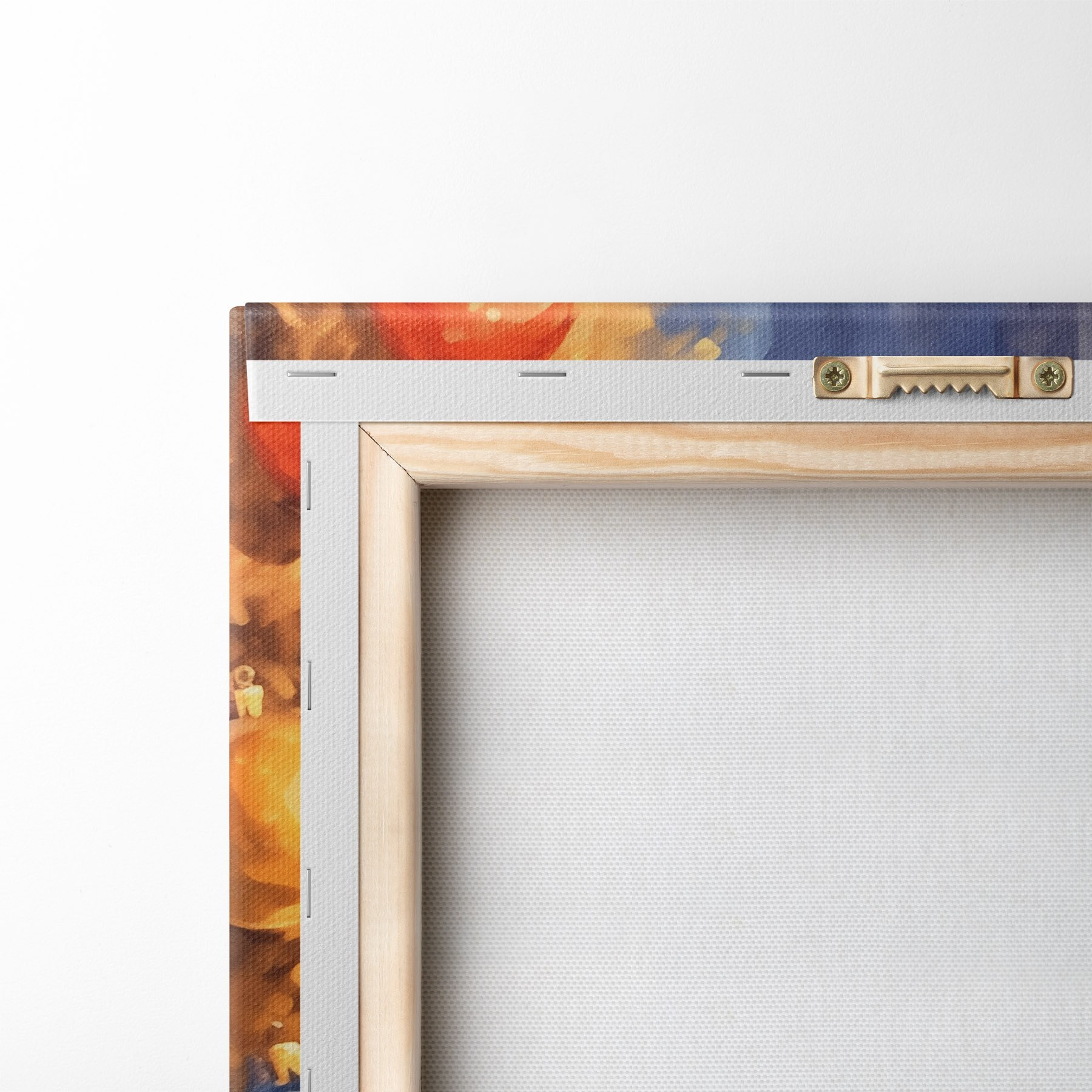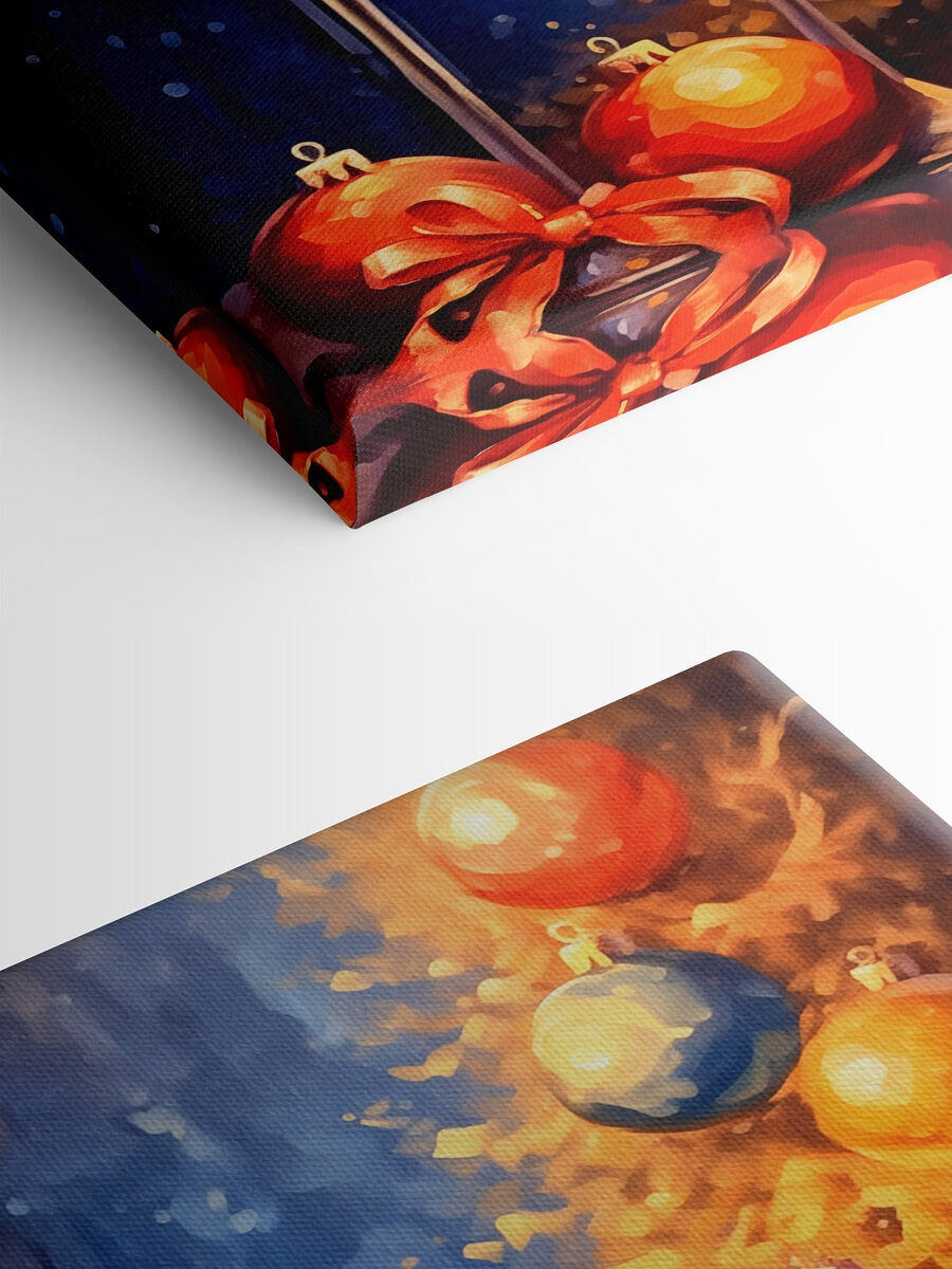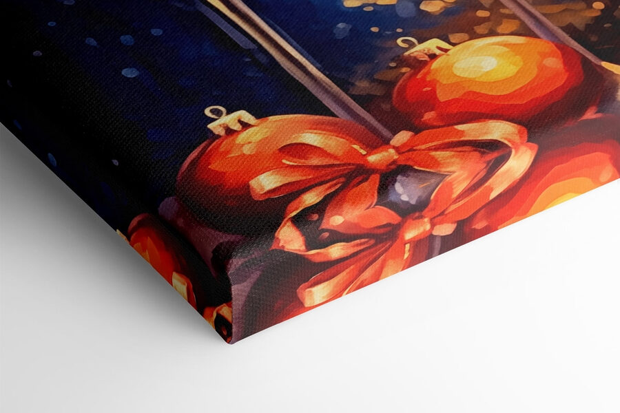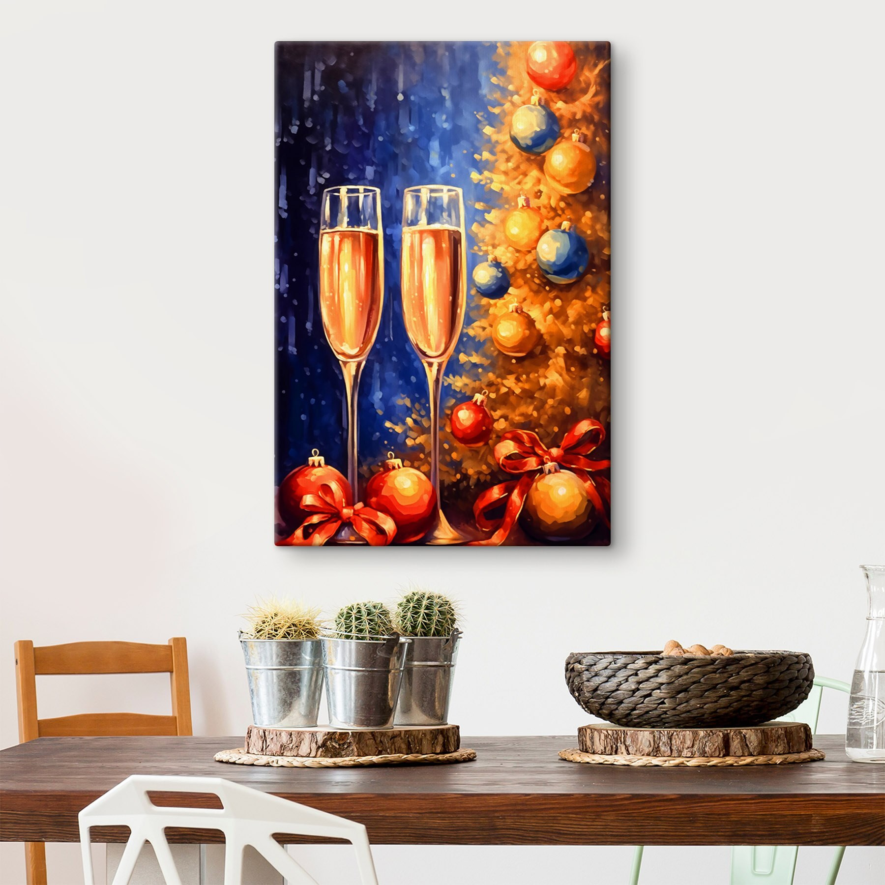Wnieś odrobinę świątecznej radości do każdej przestrzeni dzięki temu wspaniałemu drukowi na płótnie przedstawiającemu dwa musujące kieliszki do szampana umieszczone obok pięknie udekorowanej choinki. Jest to idealne rozwiązanie, gdy trzeba wznieść toast za dobre czasy, a czy jest lepsze tło niż świąteczna scena wypełniona kolorowymi ornamentami? Wyobraź to sobie na ścianie podczas świątecznych spotkań. Śmiech przyjaciół, brzęk kieliszków i aromat pieczonych smakołyków w powietrzu.