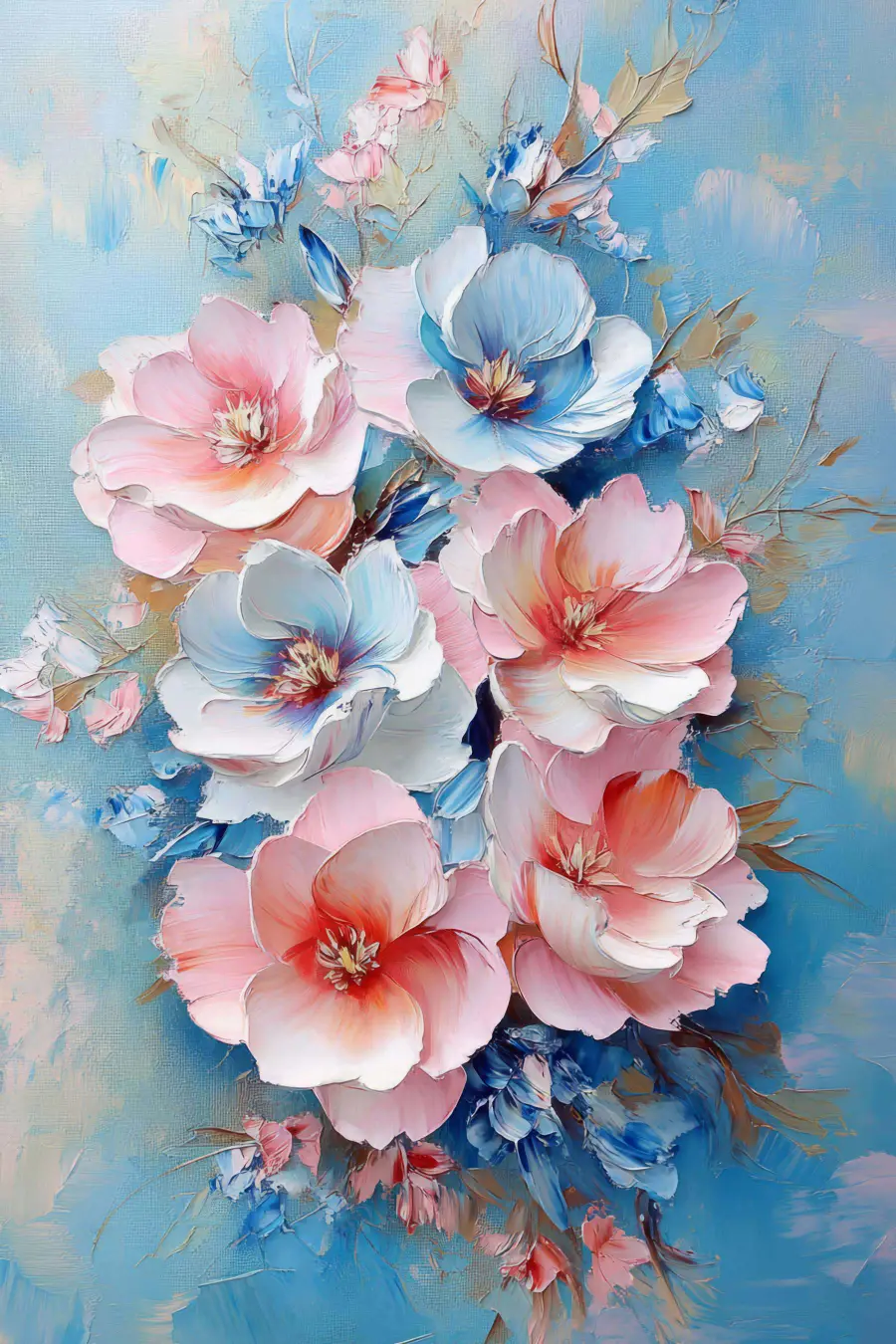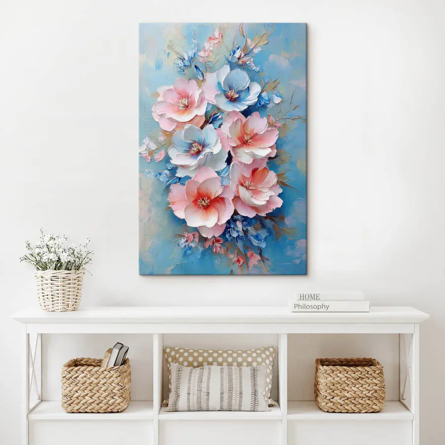 Dodaj odrobinę koloru do każdego pomieszczenia dzięki temu drukowi na płótnie przedstawiającemu kwiaty tańczące na żywym niebieskim tle. Wyobraź sobie, że wchodzisz do pomieszczenia i witają Cię te kwiaty, ich delikatne róże i uspokajające błękity, które natychmiast poprawiają nastrój. To tak, jakby mieć mały kawałek natury, który nie potrzebuje podlewania ani słońca, tylko twoje oczy, aby go podziwiać. Idealny do ożywienia przytulnego kącika lub rozjaśnienia zwykłej ściany. To codzienne przypomnienie, że piękno może być tak proste jak kwiat, nawet w najtrudniejsze dni.