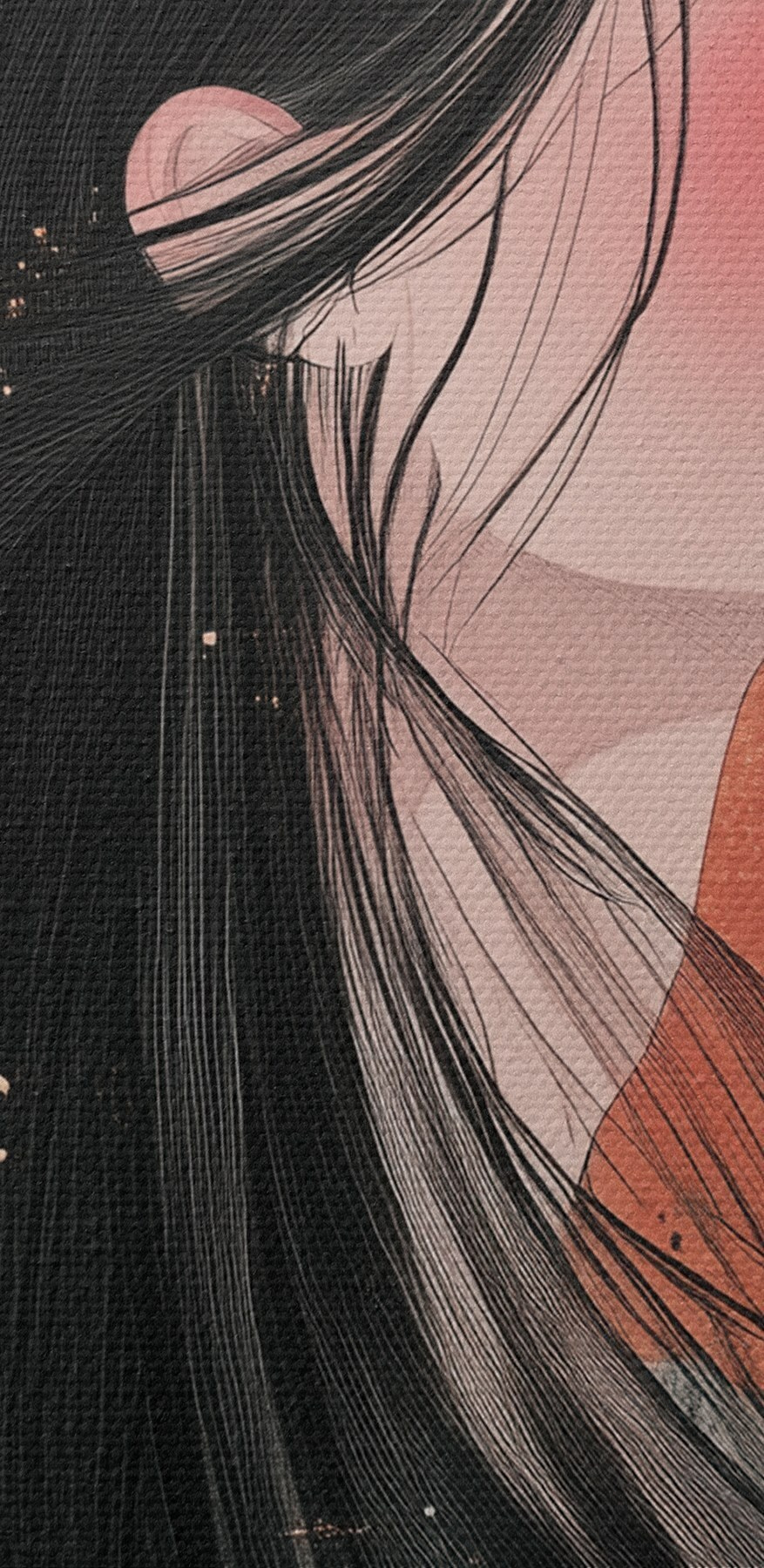 Wyobraź sobie, że wchodzisz do pokoju i zostajesz powitany przez spokojną obecność kobiety o długich czarnych włosach, uchwyconą na tym wspaniałym wydruku na płótnie. Jej profil, ustawiony na ciepłym tle, wydaje się szeptać tajemnice spokoju i wdzięku. Mieszanka delikatnych kolorów i odważnych kształtów zachęca do marzeń na jawie, a może nawet do zaparzenia filiżanki herbaty i utraty poczucia czasu. To nie tylko sztuka; to jak posiadanie uspokajającego przyjaciela na ścianie, przypominającego o oddychaniu. Idealny do przytulnego kącika, ten kawałek pobudza rozmowy i dodaje odrobinę duszy. Udekoruj swoją przestrzeń dziełem, które jest tak wyjątkowe i intrygujące jak Ty!