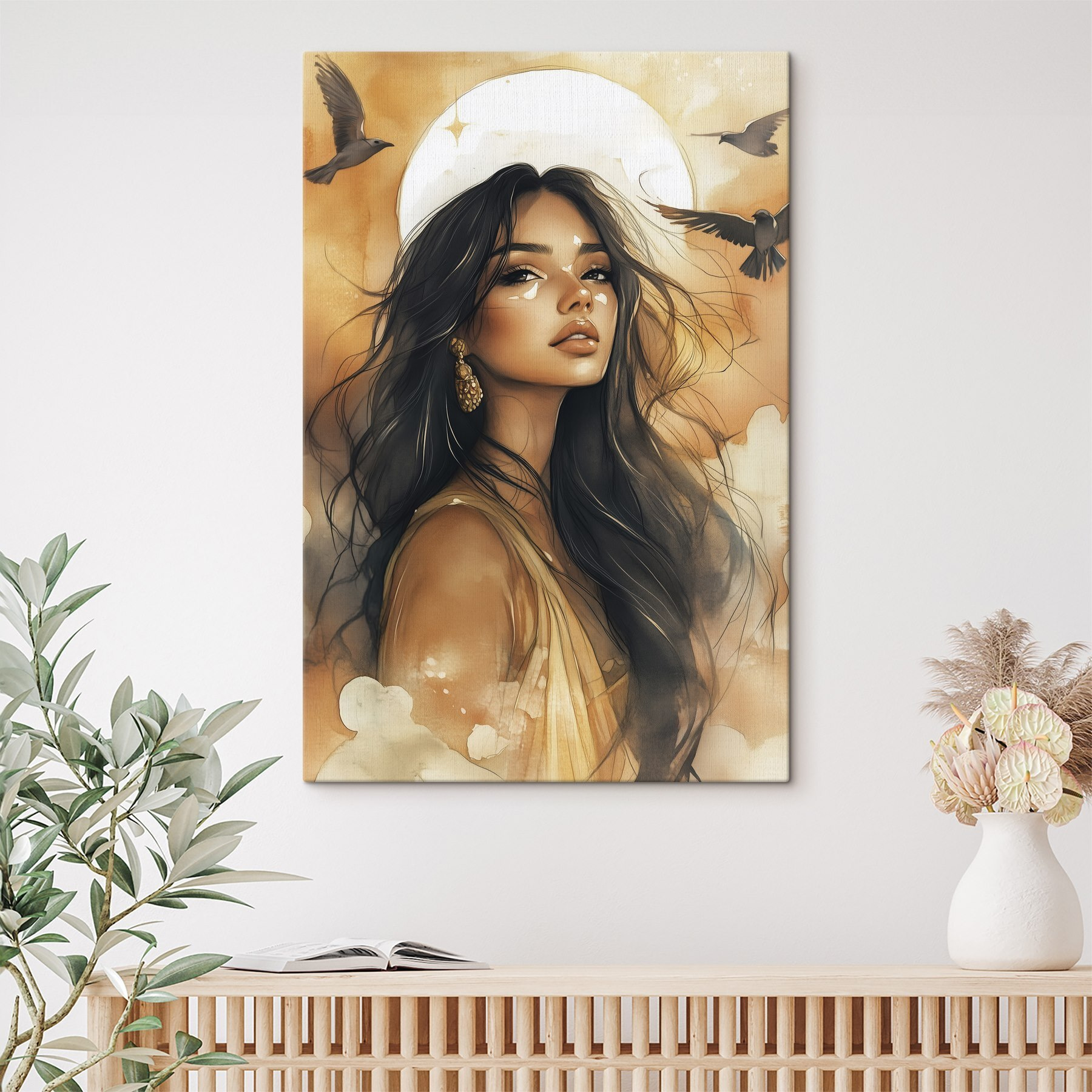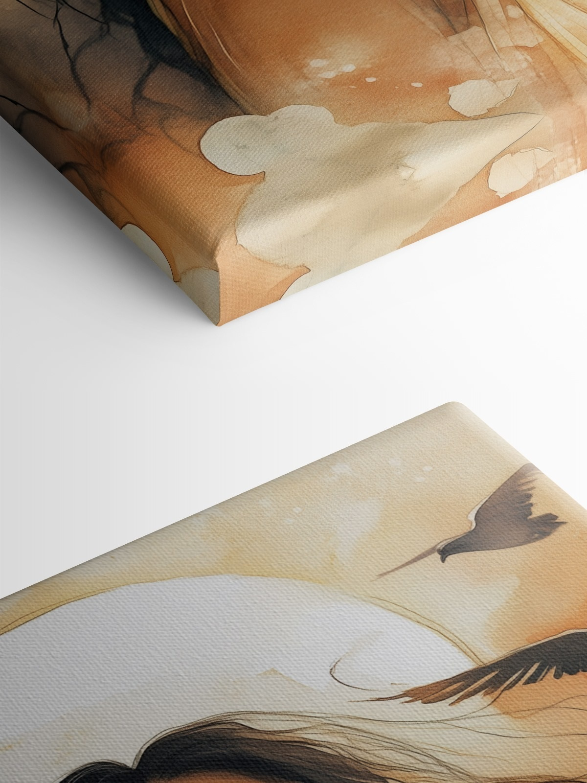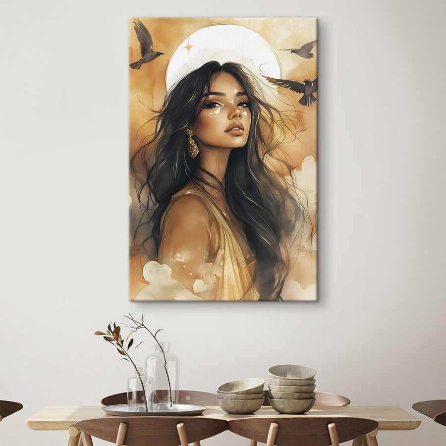 Odmień swoją przestrzeń dzięki temu oszałamiającemu drukowi na płótnie, przedstawiającemu kobietę z rozwianymi włosami i ptaki szybujące w przestworzach. To jak uchwycenie snu – w jednej chwili stoi dumnie, a w następnej pozwala bryzie unieść jej zmartwienia. Idealny dla każdego, kto pragnie odrobiny natury połączonej z nutą uduchowionego uroku, ten obraz pobudzi do rozmów, a może nawet do marzeń. Zawieś go w przytulnym kącie lub nad stylową sofą i obserwuj, jak tchnie życie w każde pomieszczenie. Kto nie chciałby odrobiny magii w swoim domu?