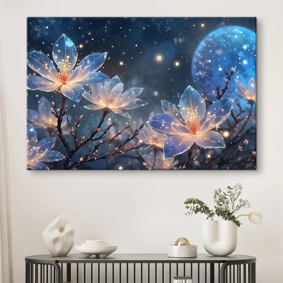 Odmień każdą przestrzeń dzięki temu czarującemu obrazowi na płótnie przedstawiającemu świetliste kwiaty. Wyobraź sobie, że wchodzisz do sennego ogrodu, w którym kwiaty delikatnie świecą pod rozgwieżdżonym niebem. To jak przeniesienie odrobiny magii do wnętrza! Idealny do rozjaśnienia przytulnego kącika lub jako dekoracja nad sofą. Goście mogą nawet zrobić podwójne spojrzenie – czy te kwiaty są prawdziwe? Dodaj odrobinę kaprysu i pozwól swoim ścianom opowiedzieć historię. Każde spojrzenie na tę grafikę jest jak delikatne przypomnienie, że piękno można znaleźć w najprostszych rzeczach. Kto by się na to nie uśmiechnął?