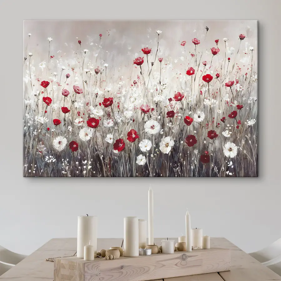 Rozjaśnij każde pomieszczenie dzięki temu wspaniałemu drukowi na płótnie przedstawiającemu zachwycający taniec czerwonych i białych kwiatów. Wyobraź sobie, że wchodzisz do pomieszczenia, w którym przed Twoimi oczami rozwija się tętniąca życiem kwiatowa łąka. To jak wprowadzenie odrobiny wiosny do wnętrza, bez kichania z powodu alergii! Pociągnięcia pędzla łączą się bez wysiłku, oddając poczucie kaprysu i lekkości.