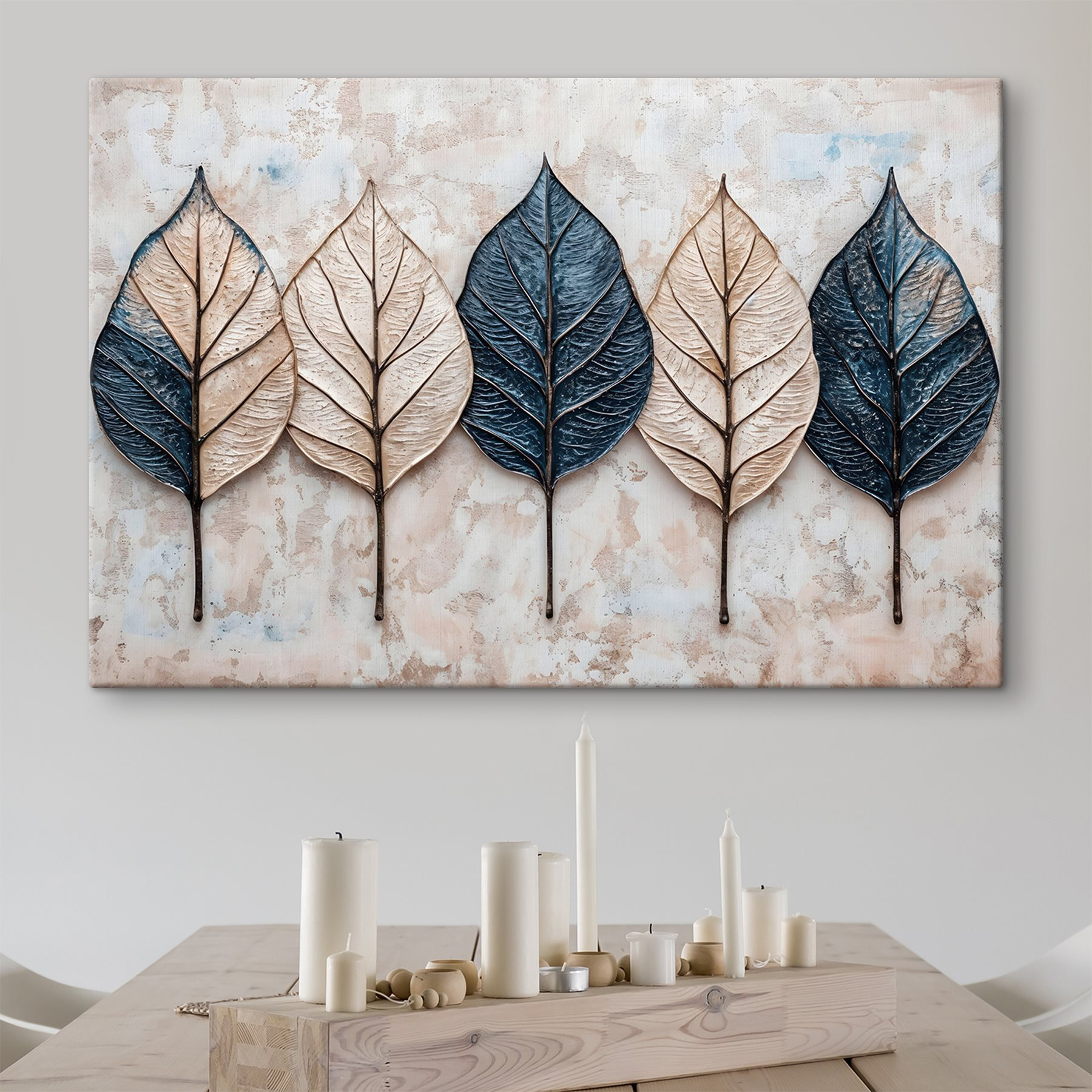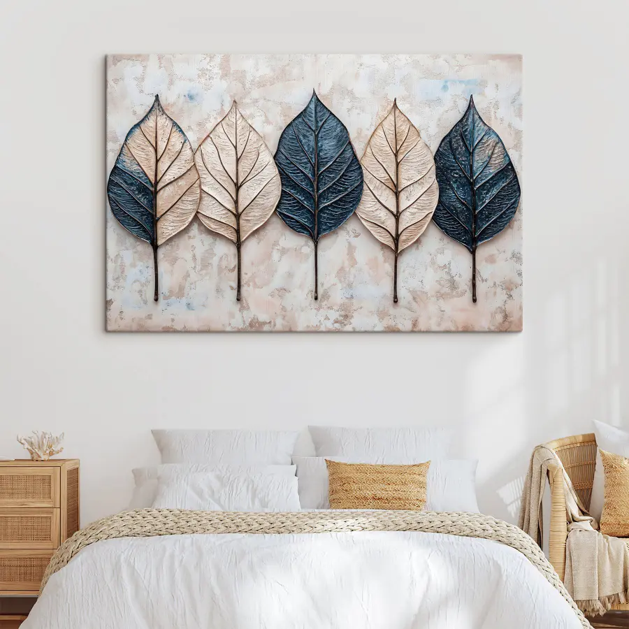Odmień swoją przestrzeń dzięki temu wspaniałemu drukowi na płótnie z rzędem delikatnych liści na miękkiej marmurowej powierzchni. To tak, jakby natura zdecydowała się na mały spacer we wnętrzu. Wyobraź sobie, że popijasz poranną kawę, delektując się spokojem, jaki zapewnia ten obraz. Ziemiste odcienie dodają ciepła, zapraszając do przytulnej atmosfery, która jest zarówno świeża, jak i zrelaksowana. Idealny do salonu lub cichego kącika do czytania, z pewnością wywoła uśmiech na twarzy. Kto by pomyślał, że liście mogą być tak urocze? Przytul swoje ściany tym pięknym połączeniem sztuki i natury!
