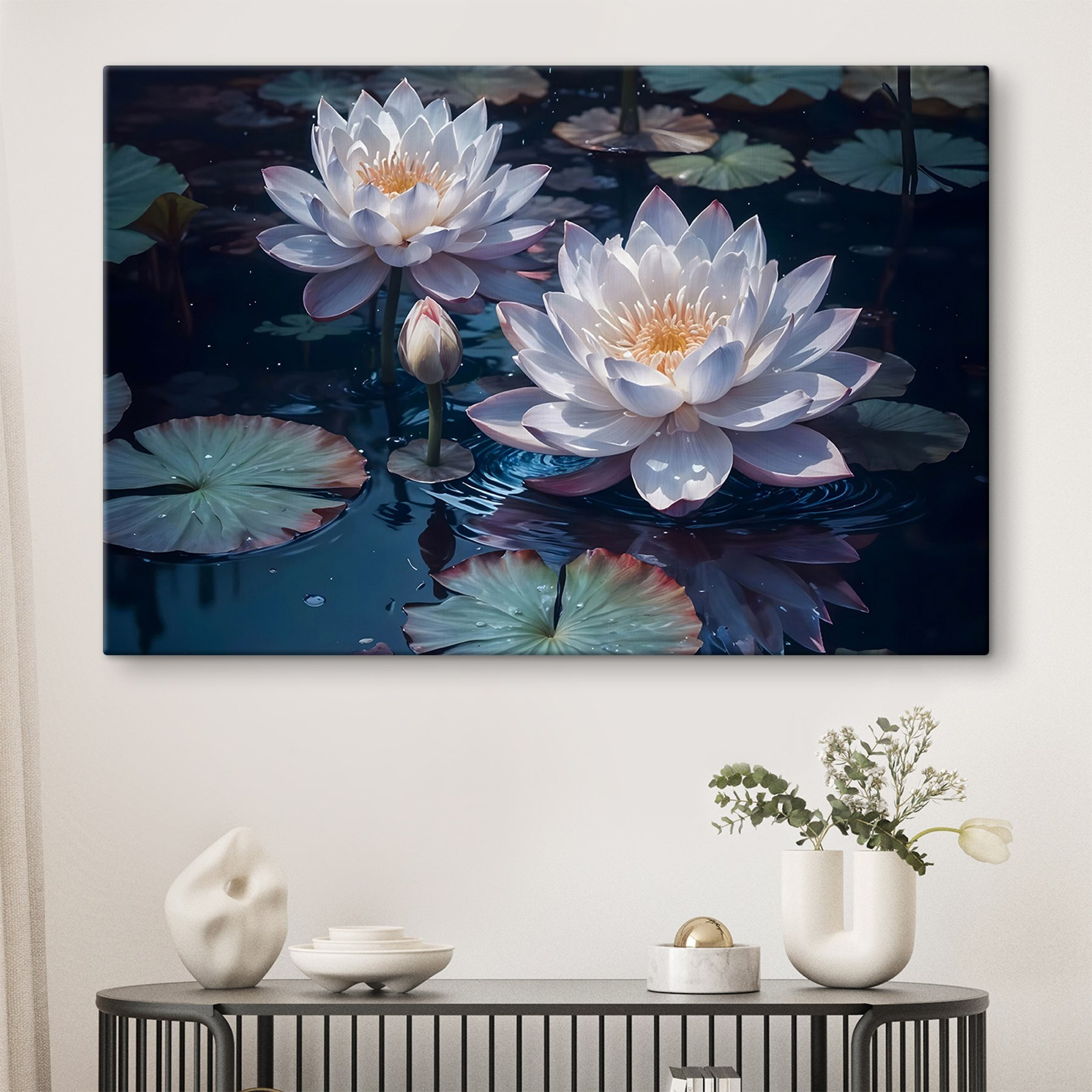 Przekształć dowolne pomieszczenie w spokojną oazę dzięki temu pięknemu drukowi na płótnie, przedstawiającemu delikatną grupę białych kwiatów z gracją unoszących się w spokojnym stawie. Wyobraź sobie, że wchodzisz do swojej przestrzeni i natychmiast czujesz, jak ogarnia cię fala spokoju – jak mini rekolekcje bez wychodzenia z domu! Miękkie kolory i delikatne refleksy zachęcają do marzeń i spokojnych chwil. Niezależnie od tego, czy rozjaśnia przytulny zakątek, czy dodaje odrobinę elegancji do salonu, ten element opowiada historię spokoju i piękna natury. To jak powiew świeżego powietrza na ścianie! Idealny zarówno dla miłośników kwiatów, jak i entuzjastów sztuki.