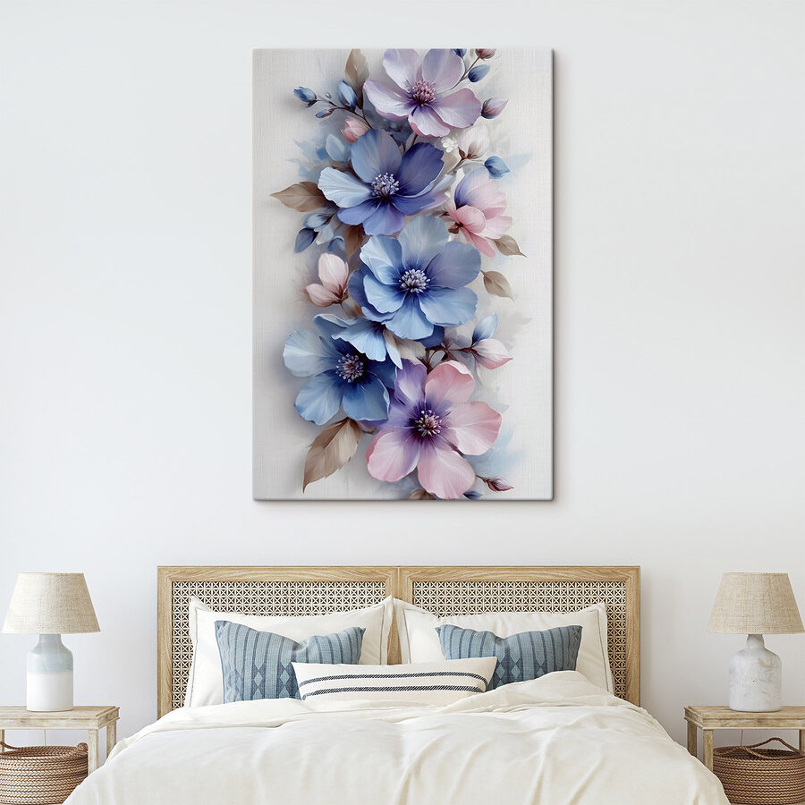 Rozjaśnij każdą przestrzeń dzięki “Delicate Blooms in Soft Hues”. Ten wydruk na płótnie przedstawia kapryśny taniec kwiatów w delikatnych błękitach i różach, idealny do wprowadzenia odrobiny natury do wnętrza. Wyobraź sobie, że popijasz poranną kawę, wpatrując się w ten piękny obraz – to tak, jakbyś miał wazon ze świeżymi kwiatami bez podlewania! Każdy płatek wydaje się szeptać słodkie nuty, dodając spokoju do pomieszczenia. Niezależnie od tego, czy ozdabia ścianę w salonie, czy sypialni, z pewnością wywoła radość i rozmowę. Kto by się nie uśmiechnął na widok tych kwiatów? Idealny dla miłośników kwiatów lub każdego, kto potrzebuje odrobiny piękna.