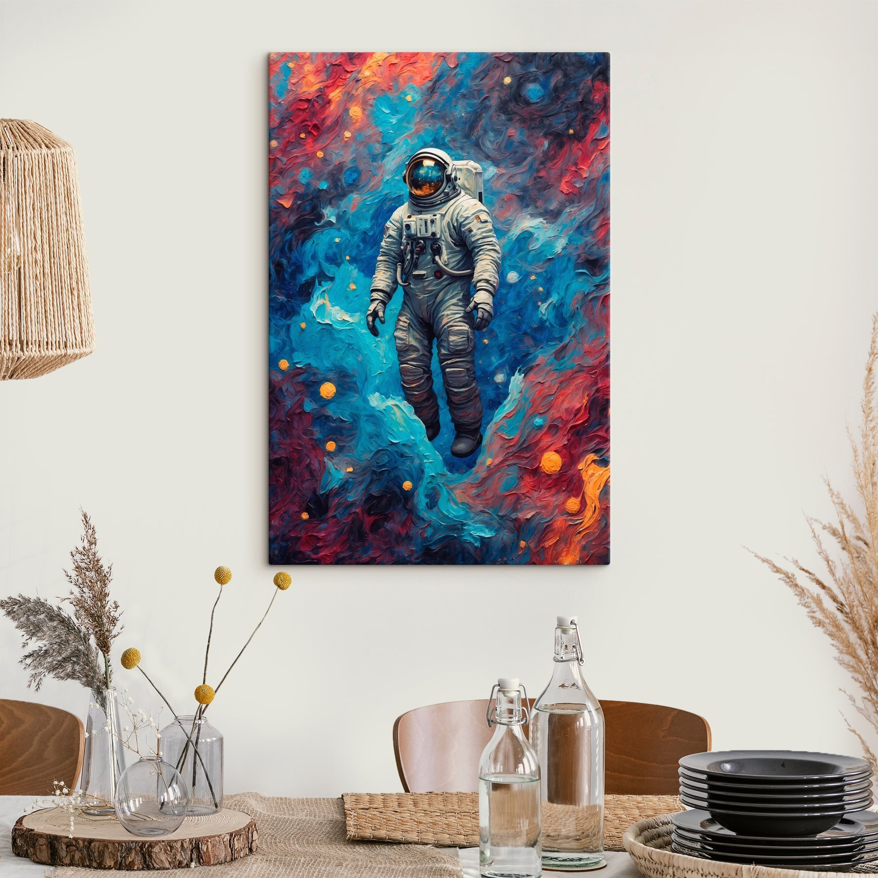 Zanurz się w świecie cudów z tym żywym płótnem przedstawiającym astronautę unoszącego się pośród kosmicznego wiru kolorów. To nie tylko sztuka; to okno na wszechświat, pobudzające myśli o przygodzie i możliwościach. Wyobraź sobie, że patrzysz na ten obraz i czujesz się, jakbyś był częścią galaktycznego tańca, w którym każdy odcień opowiada jakąś historię. Niezależnie od tego, czy znajduje się w salonie, czy w przytulnym biurze, ten nadruk może zainspirować marzenia o podróżach kosmicznych lub po prostu chwilę przerwy w pracowitym dniu. Dodaj odrobinę nostalgii i ciekawości do swojej przestrzeni, bo kto nie chciałby mieć odrobiny kosmosu w swoim domu?