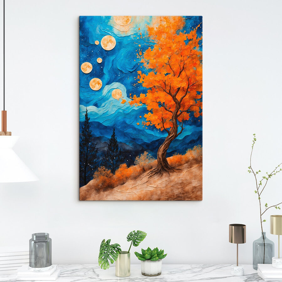 Odmień swoją przestrzeń dzięki temu oszałamiającemu drukowi na płótnie przedstawiającemu drzewo ubrane w ogniste pomarańczowe liście, stojące wysoko na tle majestatycznych niebieskich gór. To jak własna impreza niespodzianka natury! Żywe kolory przyciągają wzrok, przynosząc ciepły blask, który natychmiast poprawia nastrój. Wyobraź sobie, że popijasz kawę pod tą grafiką, czujesz spokój lasu wokół siebie lub pozwalasz swoim myślom dryfować z wiatrem. Idealny do salonów lub przytulnych zakątków, ten kawałek to nie tylko dekoracja, to mały kawałek spokoju, który można powiesić na ścianie. Kto by tego nie chciał?