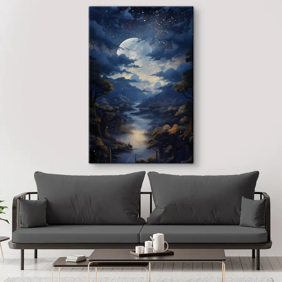 Wyobraź sobie pogodny wieczór, księżyc rzucający delikatny blask na spokojną rzekę. Ten wydruk na płótnie “Moon over a River” przenosi tę spokojną scenę wprost do Twojego domu. Dzięki delikatnym błękitom i uspokajającym cieniom zaprasza do poczucia relaksu, dzięki czemu idealnie nadaje się do przytulnego kącika do czytania lub pustej ściany, która błaga o odrobinę miłości. Wyobraź sobie, jak zwijasz się w kłębek z filiżanką herbaty, a delikatne odcienie owiewają cię jak chłodna bryza. To jak mini ucieczka na łono natury bez opuszczania swojego miejsca – kto by tego nie chciał? Ponadto jest to świetny początek rozmowy. Przygotuj się na komplementy!