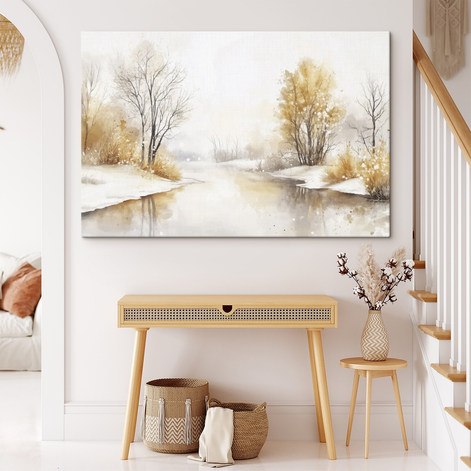 Wyobraź sobie, że przytulasz się w cichym kącie, z kawą w ręku i pozwalasz oczom wędrować po tym oszałamiającym akwarelowym płótnie przedstawiającym rzekę. To jak wejście w delikatny sen, w którym drzewa kołyszą się miękko, a śnieg szepcze tajemnice. Ciepłe odcienie ziemi bez wysiłku łączą się z chłodnymi bielami i szarościami, tworząc spokojną atmosferę, która przemawia do tych zimowych dni, kiedy chcesz po prostu hibernować. Idealny do dodania odrobiny spokoju natury do każdej przestrzeni, ten kawałek może być po prostu spokojną ucieczką, której nie wiedziałeś, że potrzebujesz. Zaufaj mi, to urocze małe marzenie na twojej ścianie!