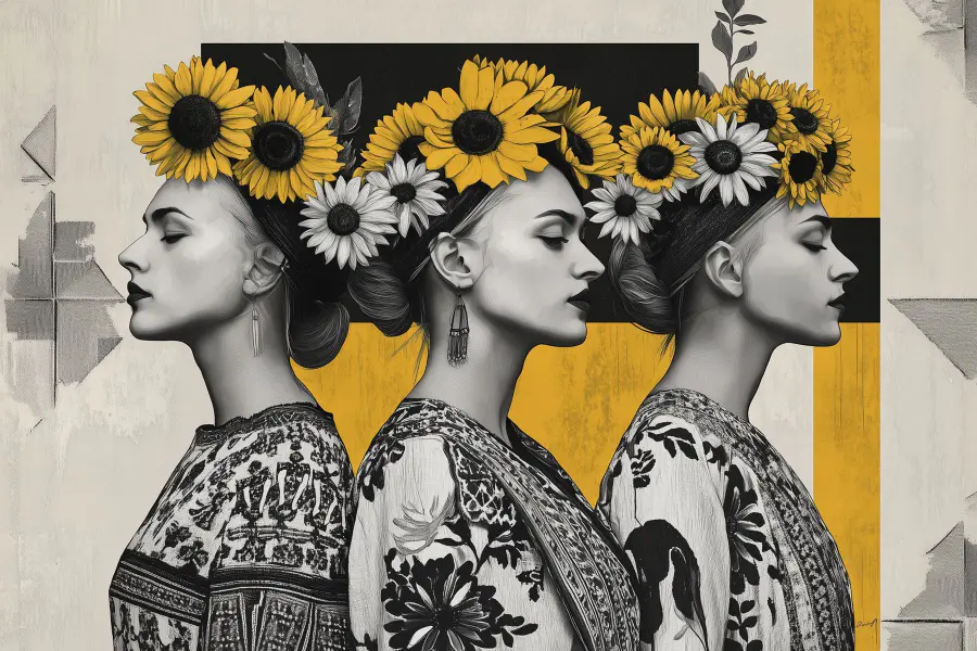 Rozjaśnij każdą przestrzeń dzięki temu żywemu drukowi na płótnie przedstawiającemu trio kobiet zwieńczonych słonecznikami, co jest ukłonem w stronę radości i ciepła. Uderzający kontrast odważnych żółci i delikatnych monochromów bez wysiłku przyciąga wzrok, tworząc zabawny, ale wyrafinowany klimat. Wyobraź sobie, że wisi w przytulnym kąciku do czytania, gdzie wywołuje rozmowy, a może nawet uśmiech lub dwa. Idealny dla tych, którzy kochają piękno natury i artystyczny styl, dodaje tego wyjątkowego akcentu – jak powiew świeżego powietrza w słoneczny dzień. To coś więcej niż tylko wystrój; to uczucie.