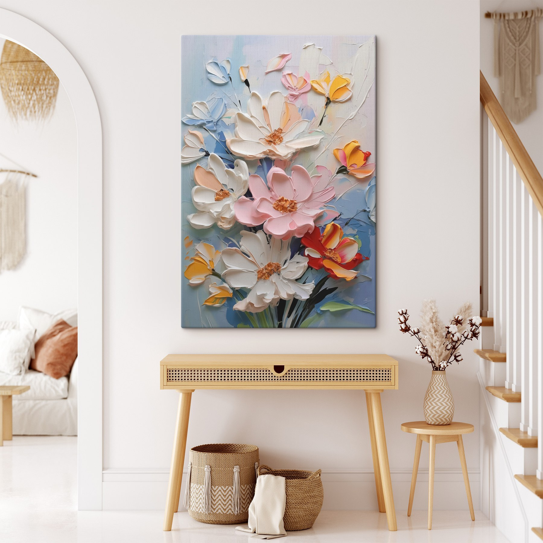 Zmień każdą ścianę w powiew świeżości dzięki temu wspaniałemu obrazowi na płótnie przedstawiającemu żywy bukiet kwiatów. Wyobraź sobie, że siedzisz w przytulnym kąciku, otoczony tymi żywymi kwiatami, które wydają się tańczyć na płótnie, dodając odrobinę uroku natury do twojej przestrzeni. Jasne kolory natychmiast poprawiają nastrój każdego pomieszczenia. Niezależnie od tego, czy znajduje się w salonie, sypialni, czy nawet w korytarzu, przywołuje uczucie wiosny przez cały rok. Idealny do marzeń na jawie lub zatracenia się w myślach przy kawie – kto by tego nie chciał? Uśmiechnij się!