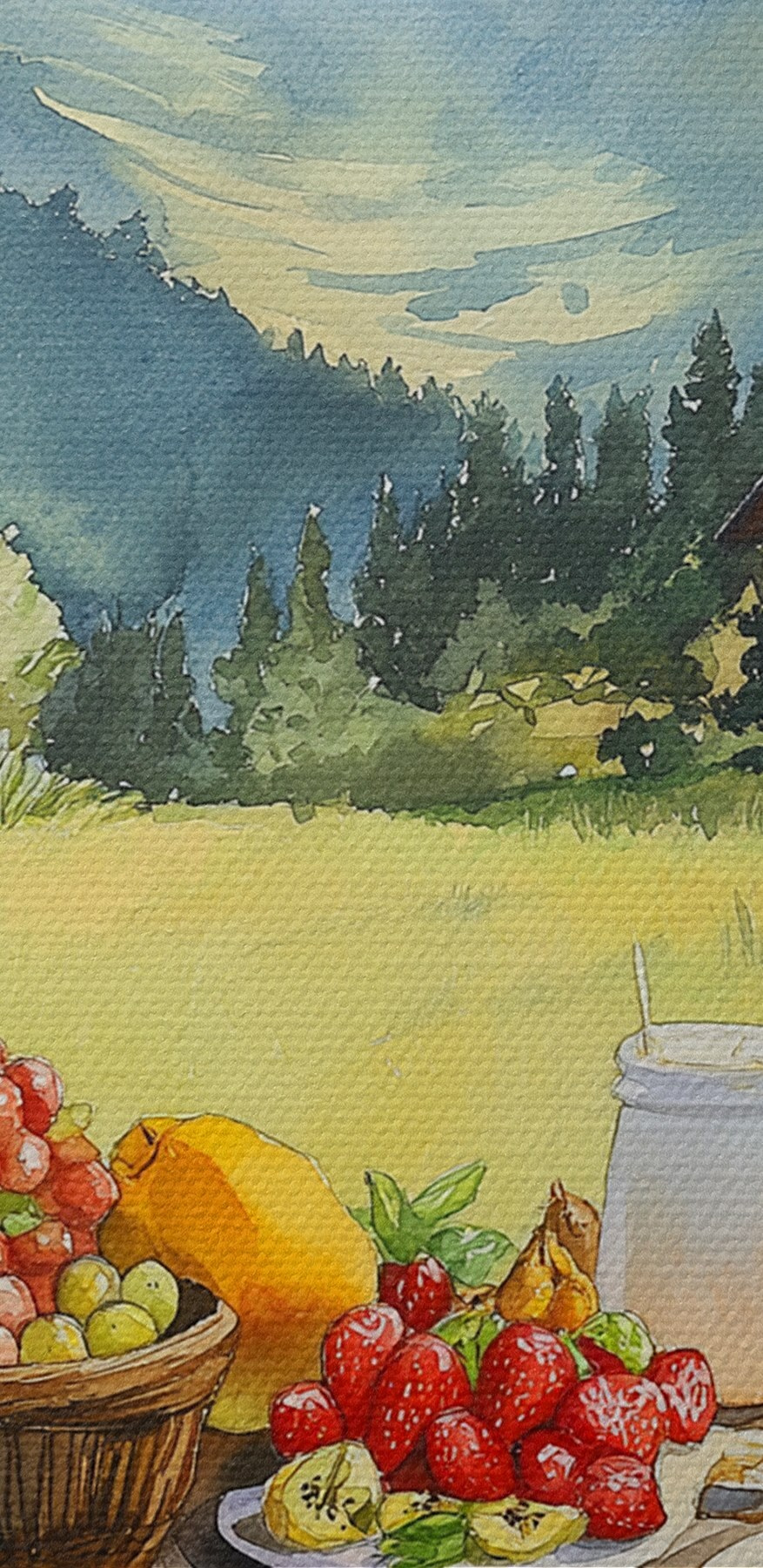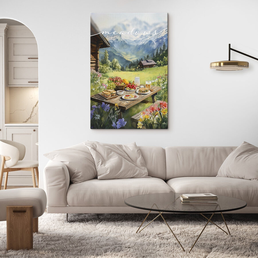 Wyobraź sobie słoneczny dzień, świeże jedzenie na polu pełnym dzikich kwiatów – ten wydruk na płótnie doskonale oddaje ten klimat. Uroczy drewniany stół zastawiony kolorowymi owocami, kanapkami i napojami jest jak zaproszenie do zebrania przyjaciół na popołudniową ucztę. Tło majestatycznych gór wnosi do pomieszczenia odrobinę przygody. Natychmiast sprawia, że każda przestrzeń staje się cieplejsza, wywołując marzenia o piknikach i śmiechu. Pachnie prawie jak świeża kawa, prawda? Jest to element, który sprawia, że chichoczesz z zachwytu za każdym razem, gdy na niego spojrzysz, przypominając sobie o prostych radościach. Posiadanie tego obrazu na ścianie jest jak powieszenie odrobiny szczęścia dokładnie tam, gdzie go potrzebujesz!