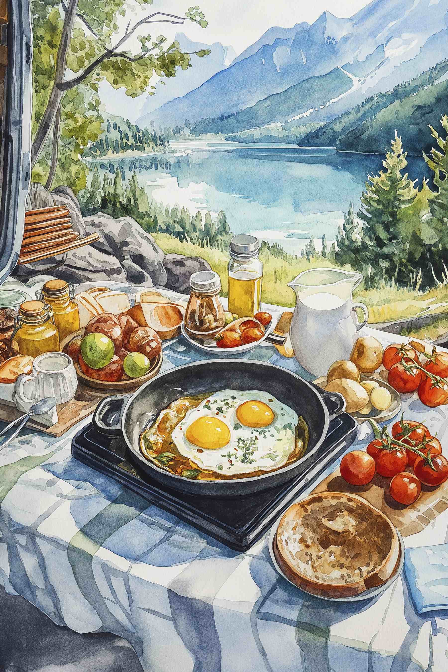 Wyobraź sobie: przytulny poranek nad jeziorem, słońce przebijające się przez drzewa, a pyszne śniadanie czeka właśnie na Ciebie. Ten wydruk na płótnie oddaje ten magiczny moment – pyszne jajka, świeże pomidory i smaczne wypieki, a wszystko to w otoczeniu oszałamiających górskich widoków. Idealny dla tych, którzy kochają jedzenie, naturę lub po prostu chcą rozjaśnić swoje ściany odrobiną smaku. To tak, jakby zaprosić kawałek spokoju na świeżym powietrzu prosto do domu. Powieś go w kuchni lub jadalni i poczuj te ciepłe wibracje każdego dnia. Kto nie chciałby codziennie przypominać sobie o słonecznych śniadaniach i dobrej zabawie?