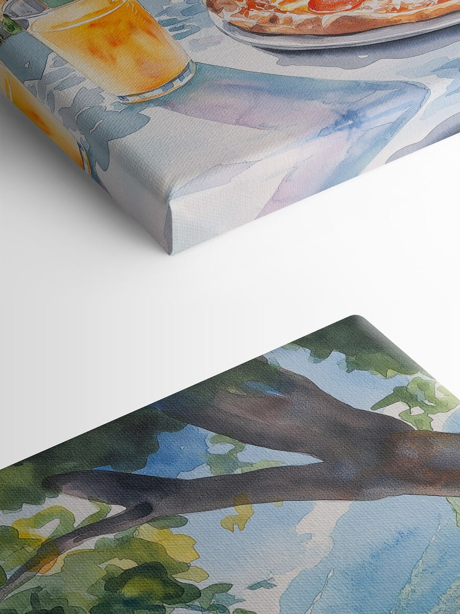 Wyobraź sobie, że siedzisz w przytulnym kącie swojej kuchni, a aromat pizzy unosi się w powietrzu. Ten obraz akwarelowy oddaje ten wymarzony moment – pyszny kawałek pizzy pepperoni w połączeniu z orzeźwiającymi napojami, a wszystko to na tle spokojnych wód i bujnych wzgórz. To idealna ucieczka, która sprawia, że w domu można poczuć się jak na wakacjach. Wyobraź sobie, że wisi na ścianie, wnosząc ciepło i radość do Twojej przestrzeni. Każde spojrzenie może przypomnieć ci leniwe popołudnia spędzone z przyjaciółmi, śmiech bulgoczący jak napoje gazowane. To nie tylko sztuka; to kawałek codziennego szczęścia!