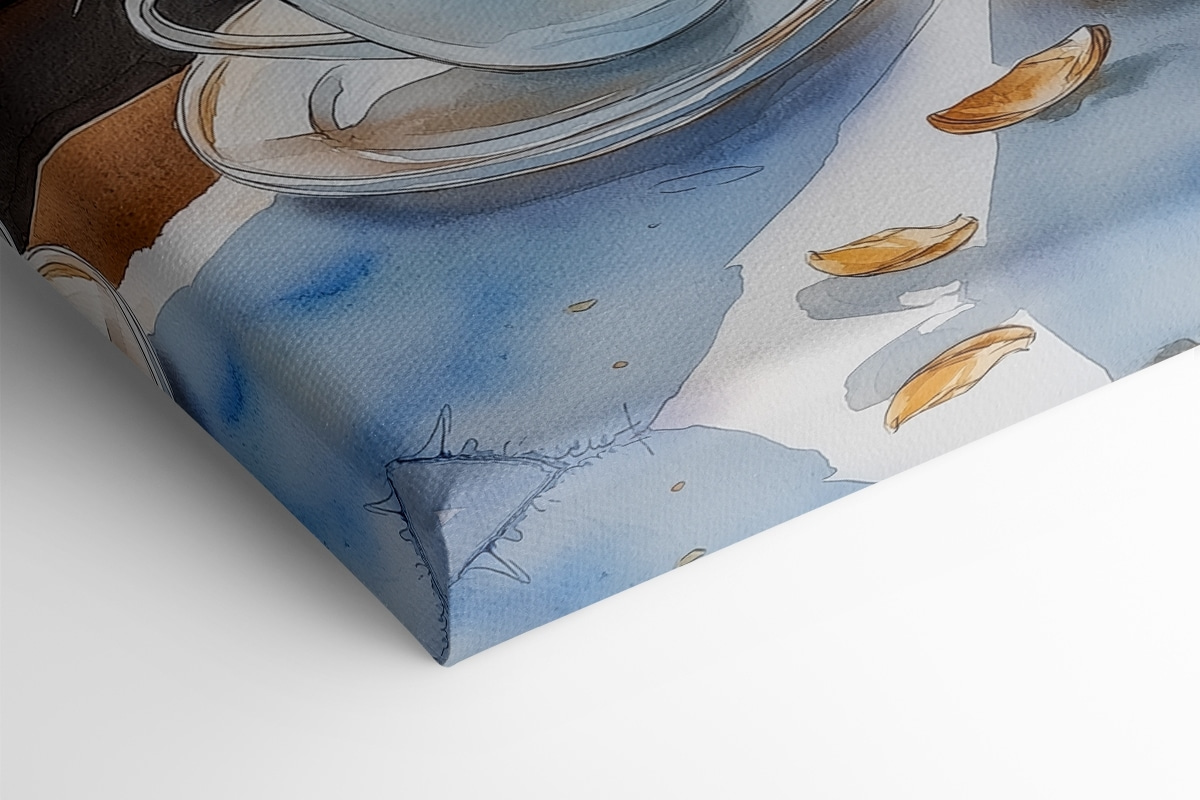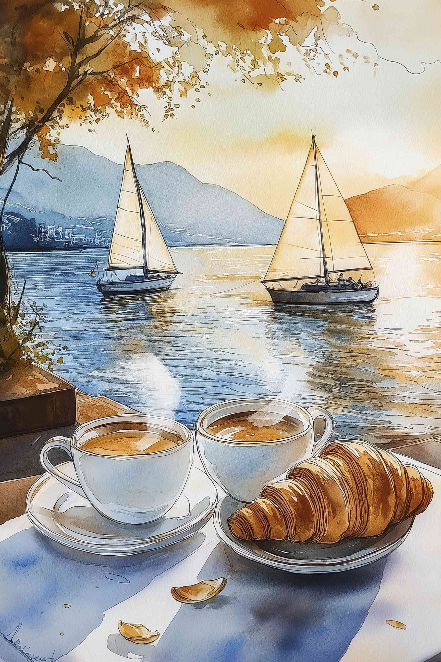 Rozjaśnij swoje ściany dzięki temu wspaniałemu obrazowi na płótnie przedstawiającemu dwie parujące filiżanki kawy i rogalika, a wszystko to w spokojnej scenerii nad wodą. Wyobraź sobie, że zaczynasz dzień w tym miejscu – światło słoneczne tańczy na wodzie, a pocieszający aromat kawy wypełnia powietrze. Jest to rodzaj przytulnej atmosfery, która sprawia, że chcesz zwinąć się w kłębek z dobrą książką lub podzielić się śmiechem z przyjacielem. Idealna do kuchni lub kącików śniadaniowych, ta grafika zachęca do ciepła i rozmowy. Poza tym, kto nie kocha odrobiny inspiracji rogalikami? Wprowadź smak kawiarnianej rozkoszy do swojego domu!