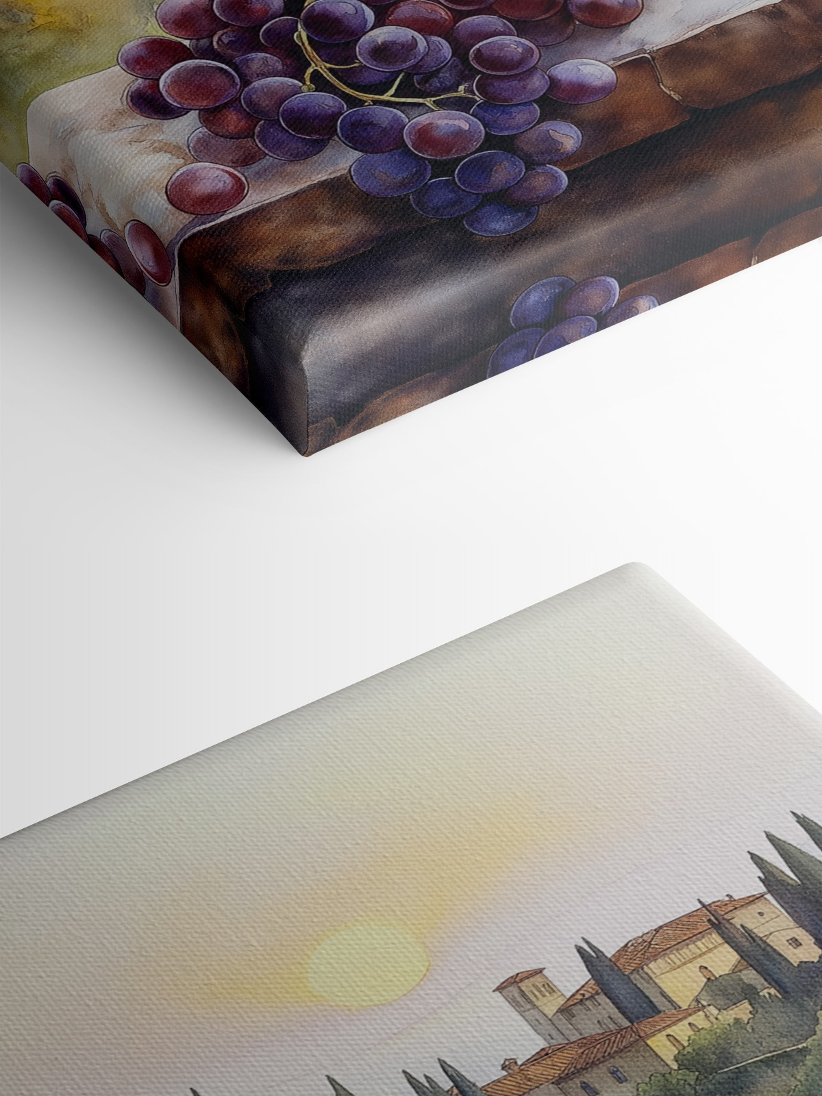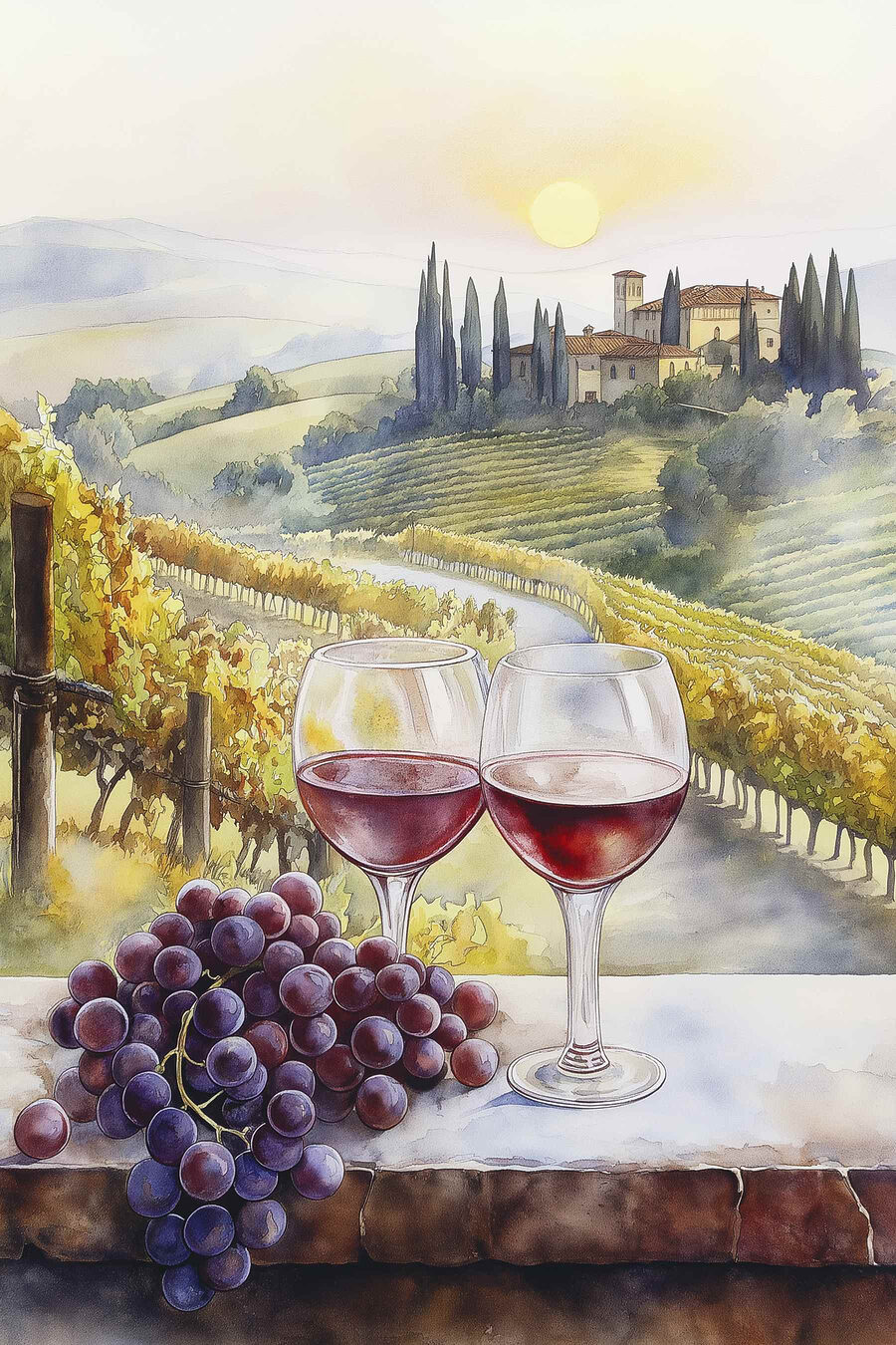 Przekształć każdą nudną ścianę w przytulną atmosferę winnicy dzięki temu akwarelowemu wydrukowi na płótnie z uroczymi kieliszkami do wina i pulchnymi winogronami. Wyobraź sobie, że popijasz pysznego Merlota, a ta grafika zabierze Cię w senną podróż do rozświetlonych słońcem winnic, gdzie powietrze wypełnia słodki zapach dojrzałych winogron i cichy śmiech. To jak przeniesienie kawałka Włoch do swojego domu! Idealny do kącika jadalnego lub eleganckiego małego baru, ten element dodaje odrobinę koloru i uroku. Któż nie poczułby się nieco fantazyjnie, delektując się kolejnym kieliszkiem wina obok takiego piękna?