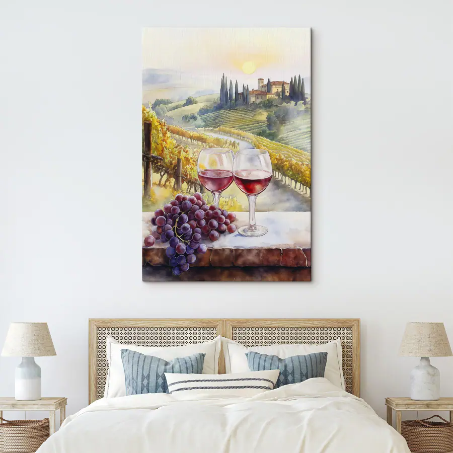 Przekształć każdą nudną ścianę w przytulną atmosferę winnicy dzięki temu akwarelowemu wydrukowi na płótnie z uroczymi kieliszkami do wina i pulchnymi winogronami. Wyobraź sobie, że popijasz pysznego Merlota, a ta grafika zabierze Cię w senną podróż do rozświetlonych słońcem winnic, gdzie powietrze wypełnia słodki zapach dojrzałych winogron i cichy śmiech. To jak przeniesienie kawałka Włoch do swojego domu! Idealny do kącika jadalnego lub eleganckiego małego baru, ten element dodaje odrobinę koloru i uroku. Któż nie poczułby się nieco fantazyjnie, delektując się kolejnym kieliszkiem wina obok takiego piękna?