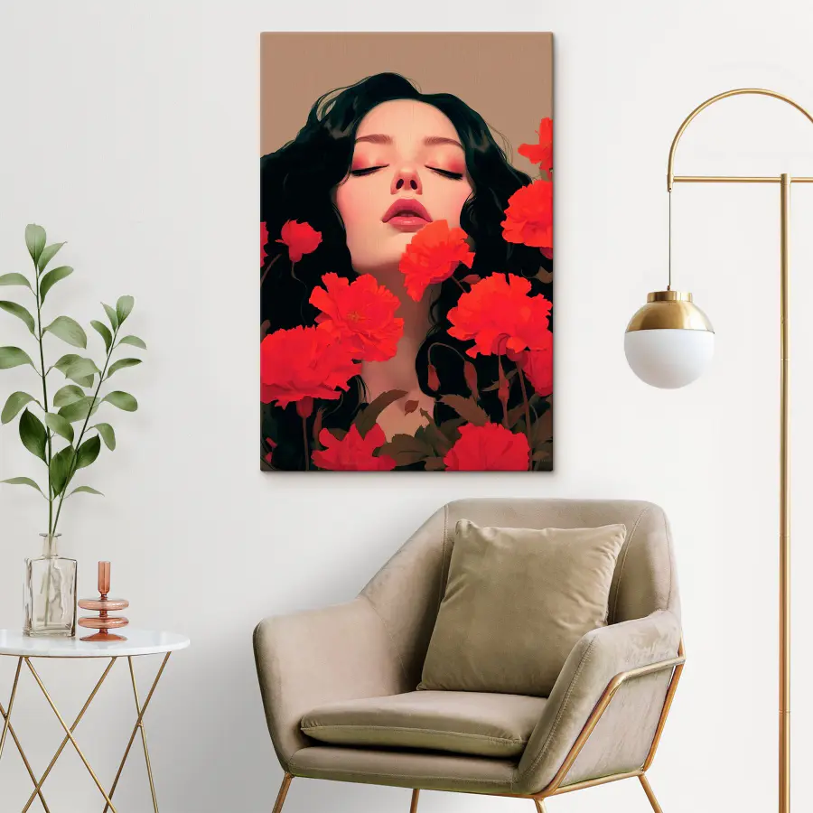 Wyobraź sobie, że wchodzisz do pokoju i witasz się z oszałamiającym wydrukiem na płótnie przedstawiającym kobietę z długimi, czarnymi włosami, całkowicie otoczoną żywymi czerwonymi kwiatami. To jak wejście do snu, w którym kolory tętnią życiem, a każdy płatek wydaje się szeptać tajemnicę. Ten obraz harmonizuje piękno natury i głębię emocji, dzięki czemu idealnie nadaje się do przytulnego salonu lub spokojnej sypialni. Wystarczy jedno spojrzenie, a zmartwienia dnia rozpłyną się, pozostawiając jedynie spokój i inspirację. To nie tylko sztuka; to uczucie – jak ciepły uścisk w chłodny dzień. Dodaj odrobinę odważnego uroku do swojej przestrzeni i pozwól ścianom mówić!