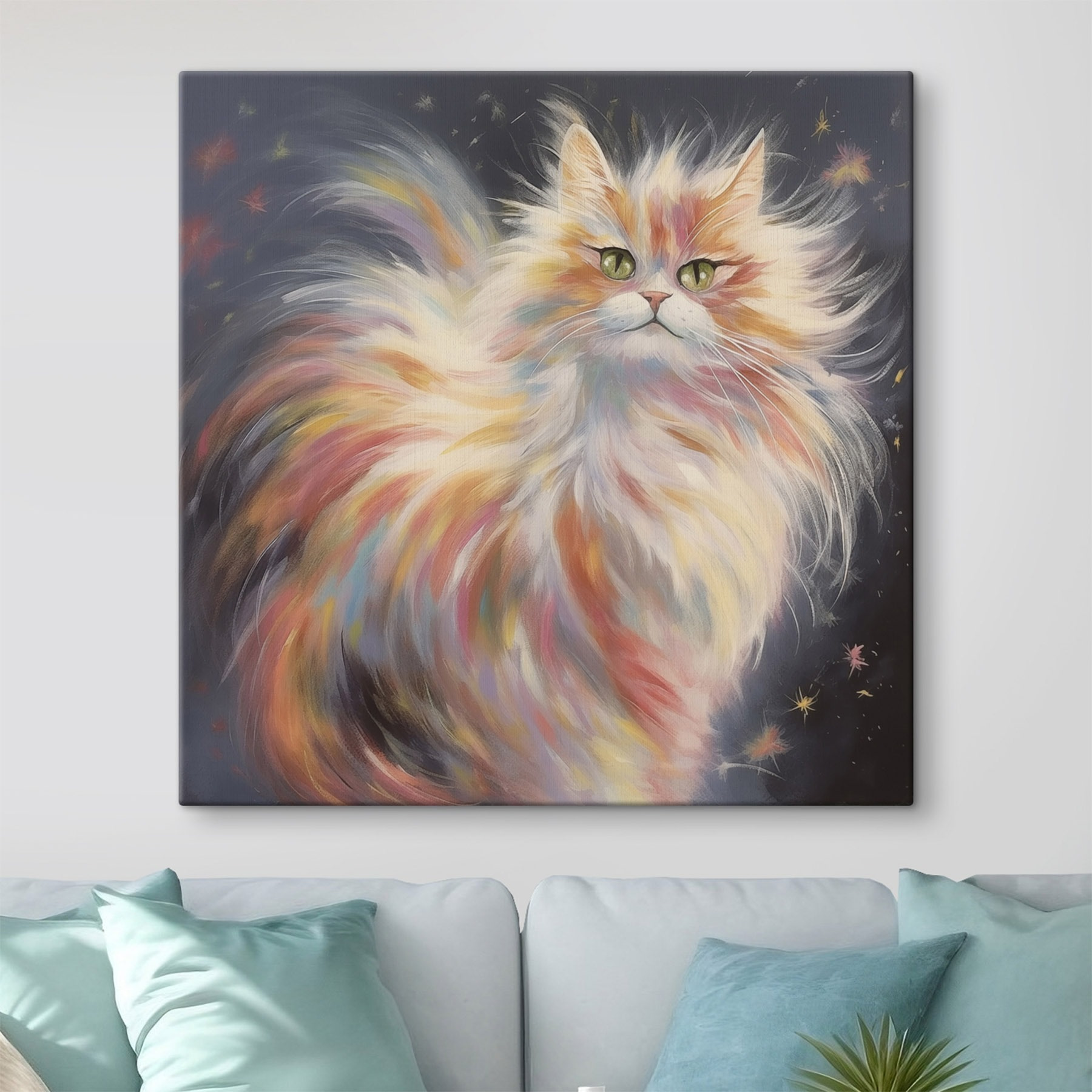 Przekształć ścianę w przytulny zakątek pełen kociego uroku dzięki temu żywemu drukowi na płótnie przedstawiającemu puszystego kota, który wydaje się mruczeć wprost z płótna. Wyobraź sobie, że wisi nad Twoim ulubionym kącikiem do czytania lub dodaje odrobinę kaprysu do pokoju rodzinnego. Te odważne kolory? Wnoszą zabawną energię, która ożywia każdą przestrzeń. Znajomi będą zatrzymywać się, wskazywać i pytać: “Jaka historia kryje się za tą kulą włosów?”. Z pewnością wywoła to kilka zabawnych rozmów. Poza tym, kto nie kocha dobrej kociej twarzy wpatrującej się w niego, gotowej rozjaśnić jego dzień?