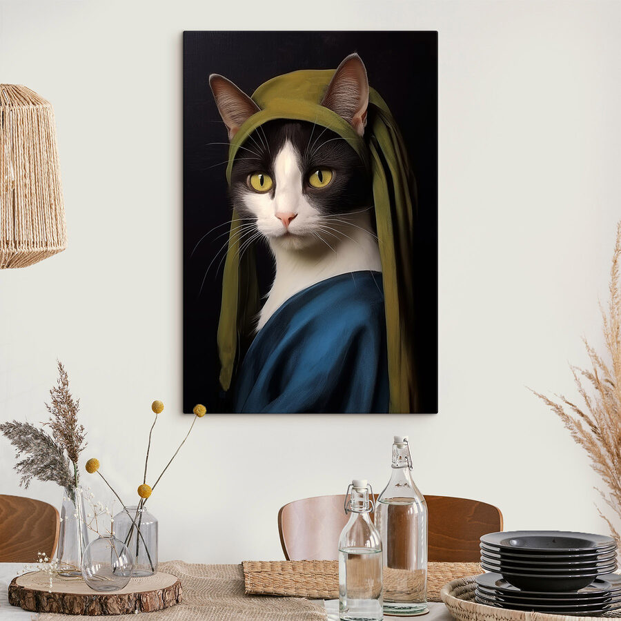 Ten wydruk na płótnie przedstawiający kota w eleganckim zielonym kapeluszu to absolutny początek rozmowy! Wyobraź sobie, że wchodzisz do pokoju i witają Cię te urzekające żółte oczy, prawie tak, jakby zapraszały Cię do małego sekretnego świata kociej rodziny królewskiej. Dzięki żywym kolorom i uroczemu zwrotowi w klasycznym stylu artystycznym, dodaje odrobinę kaprysu do każdej przestrzeni. Idealny dla miłośników kotów lub każdego, kto ceni sztukę z niespodzianką, ten nadruk z pewnością wywoła uśmiech. Może łatwo wywołać śmiech przy kawie lub stać się ukochanym elementem wystroju, który rozjaśni najnudniejsze dni.