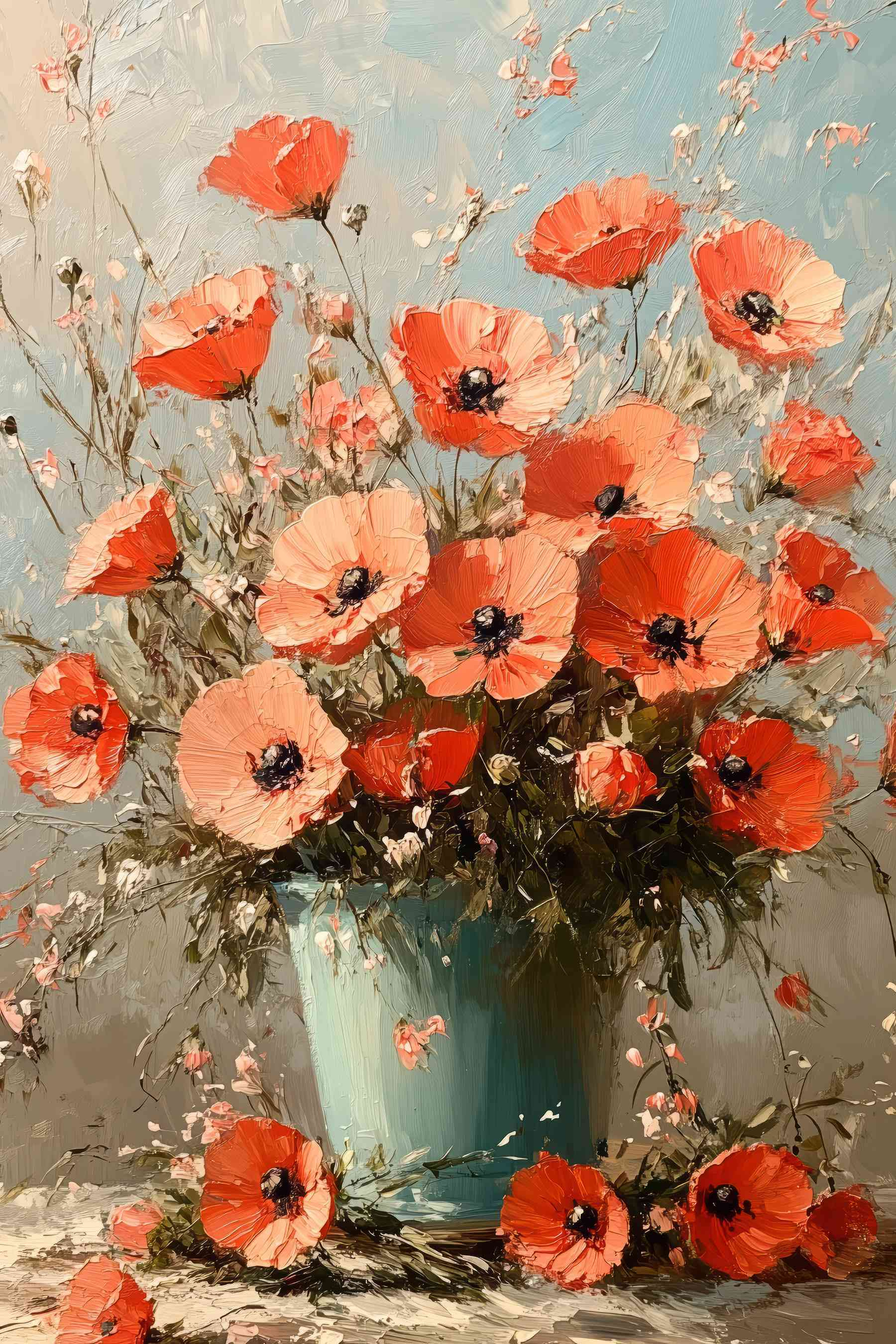 Rozjaśnij każdą przestrzeń dzięki temu oszałamiającemu obrazowi “Obraz Painting of Flowers in a Blue Vase”. Te wesołe maki wydają się tańczyć z radości, prawda? Wyobraź sobie: wchodzisz po długim dniu i bum! Te żywe kwiaty witają Cię jak ciepły uścisk. Miękki niebieski wazon dodaje orzeźwiającego popu, dzięki czemu jest idealnym początkiem rozmowy. Wyobraź sobie przyjaciół podziwiających: “Wow, gdzie to znalazłeś?”. Cóż, chodzi o małe rzeczy, prawda? Niech ten element przeniesie Cię do spokojnego ogrodu, nawet jeśli znajduje się on tylko w Twoim salonie. Odrobina natury, która nigdy nie więdnie – brzmi idealnie, prawda?