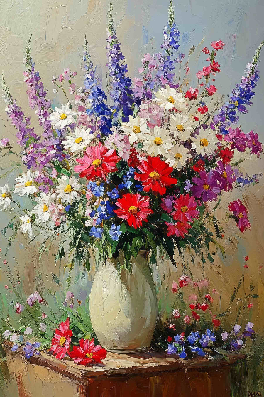 Rozjaśnij każde pomieszczenie tym wspaniałym wydrukiem na płótnie przedstawiającym wazon wypełniony kolorowymi kwiatami. To jak posiadanie ogrodu w domu, bez uciążliwych pyłków! Te żywe czerwienie, błękity i fiolety tańczą na płótnie, przynosząc ciepło i radość. Wyobraź sobie ten obraz w słonecznym zakątku – może przy oknie – gdzie światło słoneczne może oświetlić te odważne kolory. To idealne miejsce na przytulne pogawędki lub spokojne popołudnie z filiżanką herbaty. Zaufaj mi, goście będą się zatrzymywać i uśmiechać, a może nawet opowiadać historie o swoich ulubionych kwiatach. To prosty akcent, który dodaje mnóstwo uroku!
