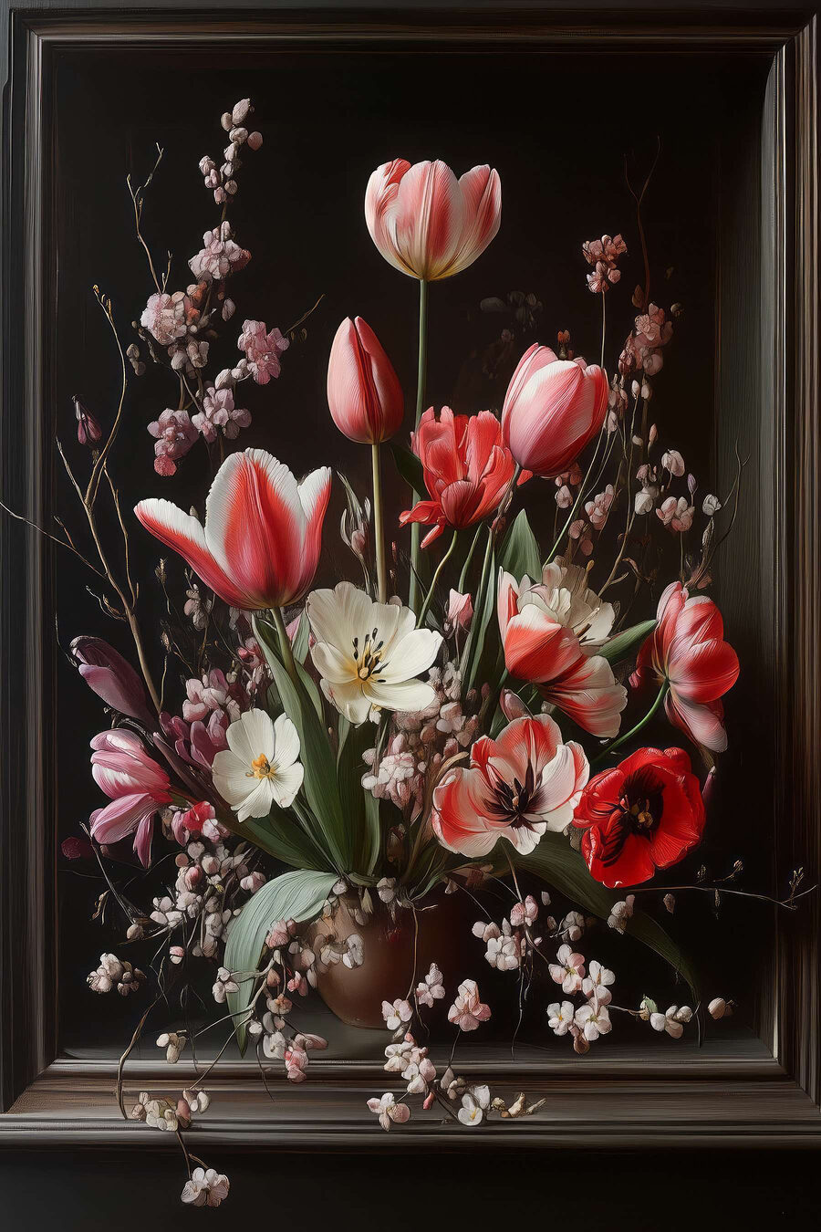 Wnieś odrobinę natury do wnętrza dzięki temu oszałamiającemu obrazowi na płótnie “Bukiet kwiatów w wazonie”. To jak posiadanie tętniącego życiem ogrodu, który nigdy nie więdnie! Te bujne kwiaty w delikatnych różach, bielach i ognistych czerwieniach tańczą na eleganckim, ciemnym tle, dzięki czemu wyglądają, jakby były gotowe do rozmowy – prawdopodobnie o tym, jak sprawią, że Twoja przestrzeń będzie cieplejsza i bardziej zachęcająca.