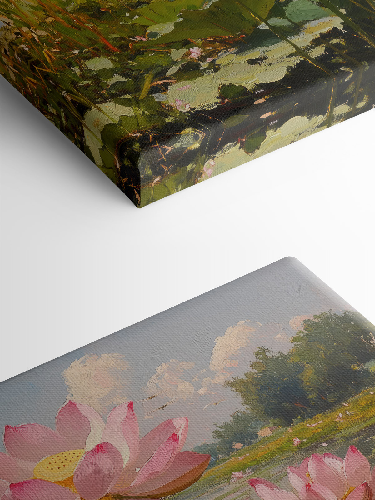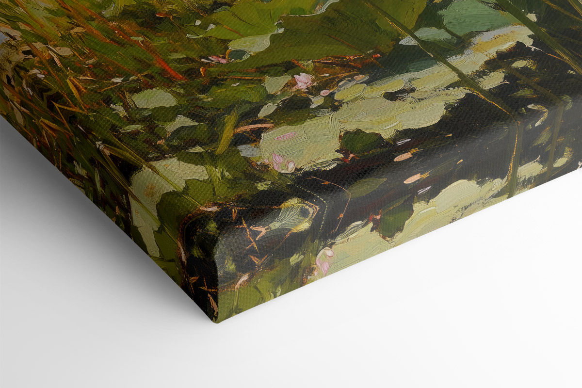 Odmień swoją przestrzeń dzięki temu czarującemu obrazowi na płótnie przedstawiającemu różowe kwiaty na spokojnym jeziorze. Wyobraź to sobie: spokojne popołudnie, słońce świecące w dół i te delikatne kwiaty kołyszące się delikatnie nad wodą. To jak przeniesienie kawałka natury prosto do domu. Ten kawałek dodaje odrobinę spokoju, idealny do przytulnego kącika do czytania lub tętniącego życiem salonu. Przyjaciele mogą nawet zatrzymać się, aby cieszyć się widokiem. Z każdym spojrzeniem, jest to delikatne przypomnienie, aby zatrzymać się, oddychać i docenić małe rzeczy w życiu. Czego tu nie kochać?