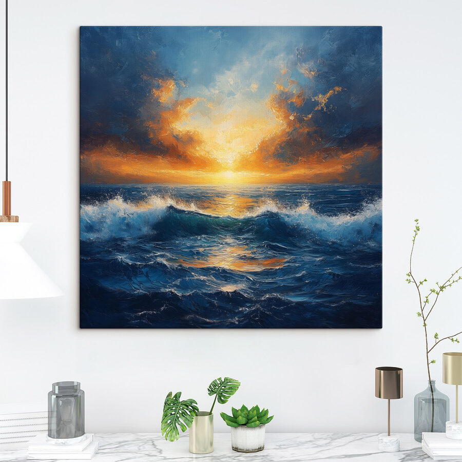 Oddychaj oceanicznym powietrzem! Ten obraz na płótnie “Zachód słońca nad oceanem” przenosi oszałamiające piękno natury wprost do salonu. Wyobraź sobie: wylegujesz się na sofie, a ten tętniący życiem zachód słońca jest na wyciągnięcie ręki. Ogniste pomarańcze, głębokie błękity i spokojne fale – wszystko to bawi się razem jak na imprezie tanecznej o zachodzie słońca. To prawie tak, jakby ocean szeptał tajemnice, podczas gdy ty popijasz kawę. Idealny na te dni, kiedy potrzebujesz małej ucieczki lub inspiracji. Powieś go, usiądź wygodnie i pozwól swoim zmartwieniom odpłynąć, fala po fali. To codzienne przypomnienie o cudach natury bez konieczności używania ręcznika plażowego.