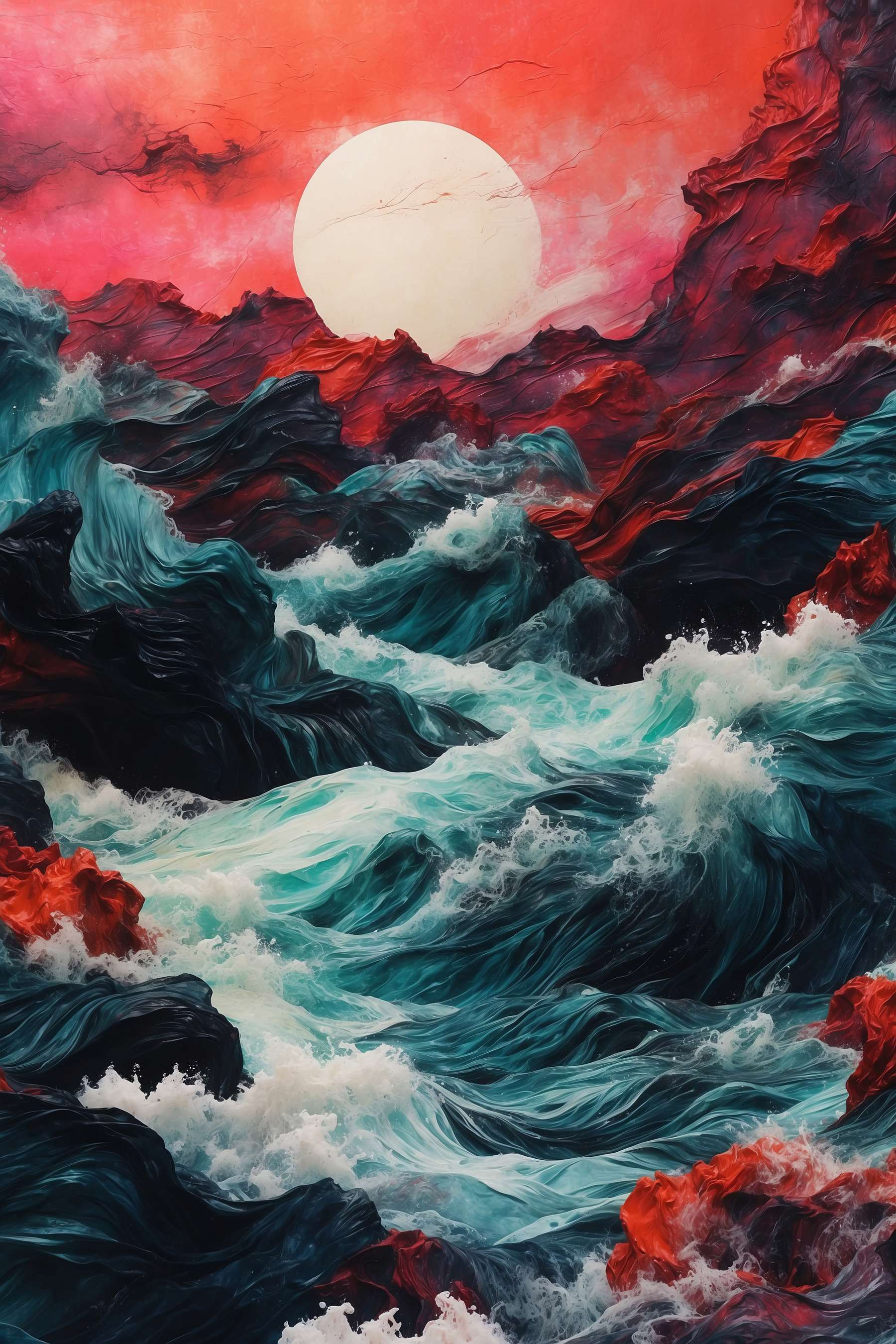 Zanurz się w kojącym wirze tego oszałamiającego wydruku na płótnie “Obraz Painting of waves and mountains”. Wyobraź to sobie: żywe fale rozbijające się o surowe góry, a wszystko to pod sennym zachodem słońca. To jak mini wakacje na ścianie!