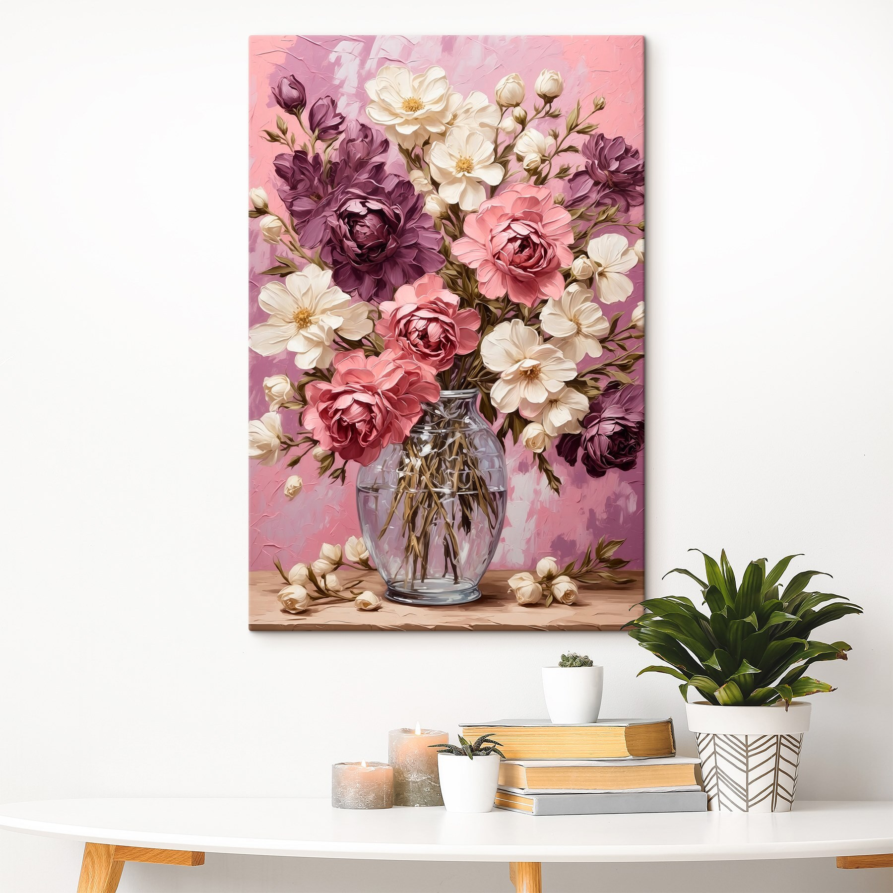Ten wydruk na płótnie przedstawiający żywe kwiaty w wazonie jest jak przeniesienie ogrodu do przestrzeni mieszkalnej, bez kichania z powodu pyłków! Delikatne róże i fiolety tańczą razem, tworząc błogą atmosferę idealną do przytulnego kącika do czytania lub tej pustej ściany, która wciąż się na ciebie gapi. Wyobraź sobie, że popijasz kawę z tym pięknym dziełem sztuki w pobliżu, zapewniając radosny plusk koloru, który po prostu poprawia nastrój. To urocze przypomnienie o pięknie natury, być może inspirujące do pielęgnowania własnego zielonego kciuka lub po prostu podziwiania widoku z daleka. Idealny dla miłośników kwiatów i tych, którzy cenią sobie odrobinę kreatywności!