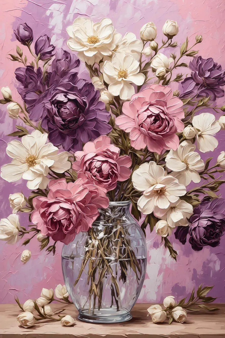 Ten wydruk na płótnie przedstawiający żywe kwiaty w wazonie jest jak przeniesienie ogrodu do przestrzeni mieszkalnej, bez kichania z powodu pyłków! Delikatne róże i fiolety tańczą razem, tworząc błogą atmosferę idealną do przytulnego kącika do czytania lub tej pustej ściany, która wciąż się na ciebie gapi. Wyobraź sobie, że popijasz kawę z tym pięknym dziełem sztuki w pobliżu, zapewniając radosny plusk koloru, który po prostu poprawia nastrój. To urocze przypomnienie o pięknie natury, być może inspirujące do pielęgnowania własnego zielonego kciuka lub po prostu podziwiania widoku z daleka. Idealny dla miłośników kwiatów i tych, którzy cenią sobie odrobinę kreatywności!