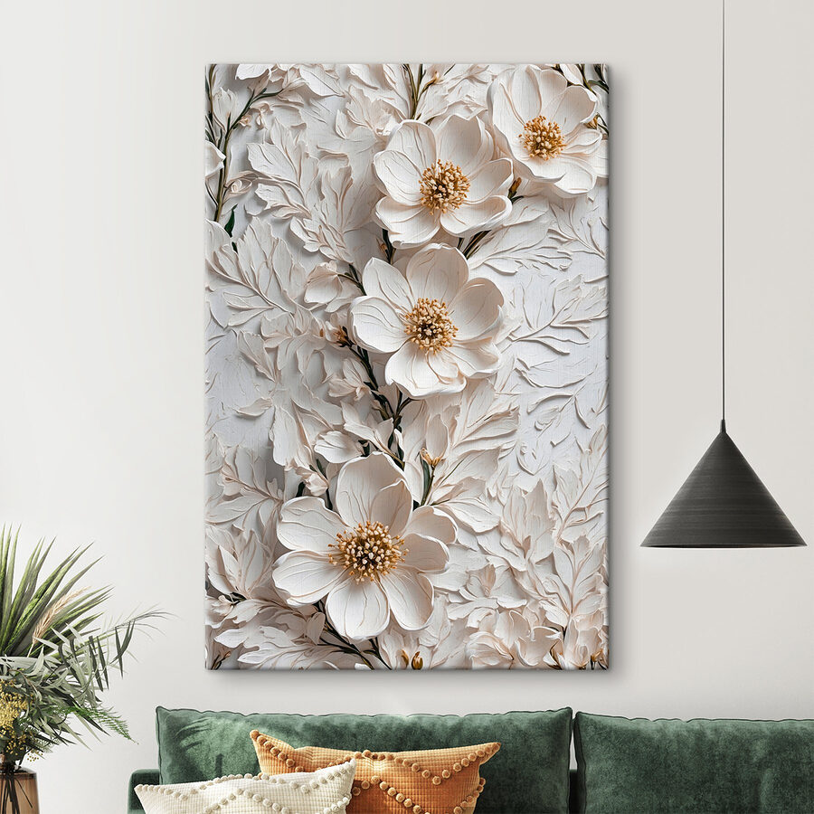 Ożyw każdą ścianę dzięki temu wspaniałemu drukowi na płótnie przedstawiającemu białe kwiaty na delikatnym białym tle. To jak powiew świeżego powietrza w Twojej przestrzeni życiowej, zapraszający spokojne wibracje i dotyk natury bezpośrednio do wnętrza. Wyobraź sobie, że popijasz poranną kawę, gubiąc się w delikatnych szczegółach – każdy płatek wydaje się szeptać tajemnice wiosny. Idealny do przytulnych zakątków lub do rozjaśnienia przyciemnionego korytarza, sprawi, że wystrój będzie lekki i wesoły. Ponadto dobrze komponuje się ze wszystkim. Dodaj odrobinę kwiatowego uroku do swojego życia i obserwuj, jak wywołuje uśmiech za każdym razem, gdy przechodzisz obok.