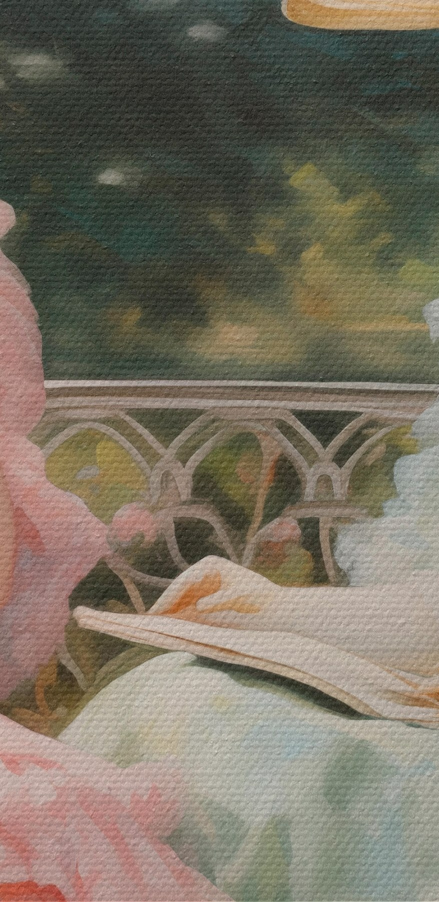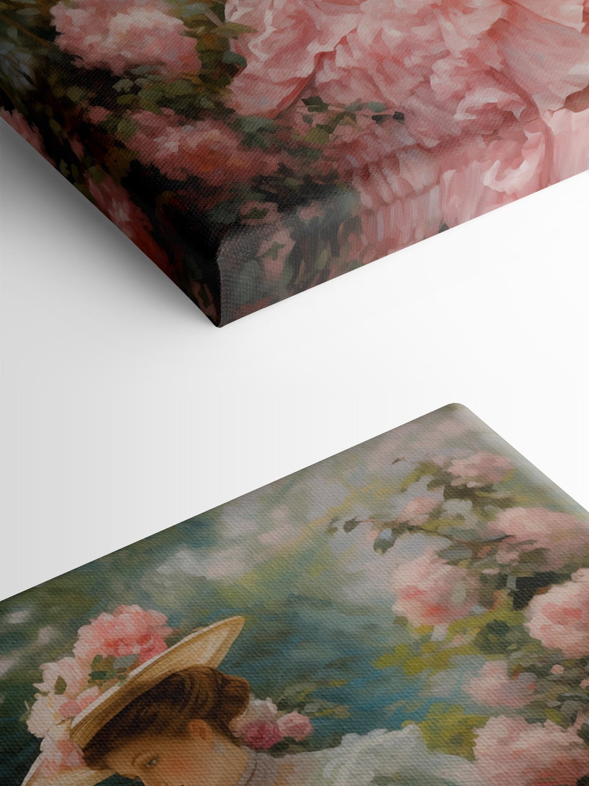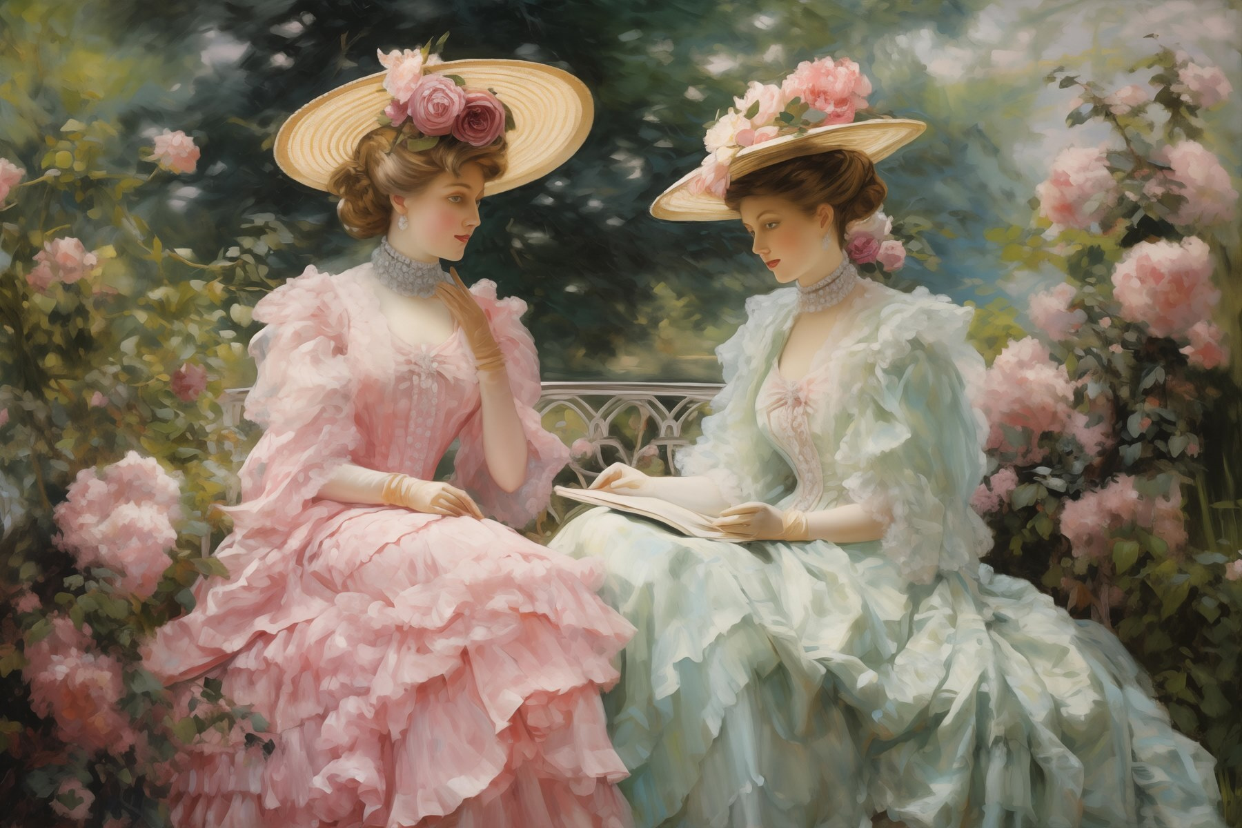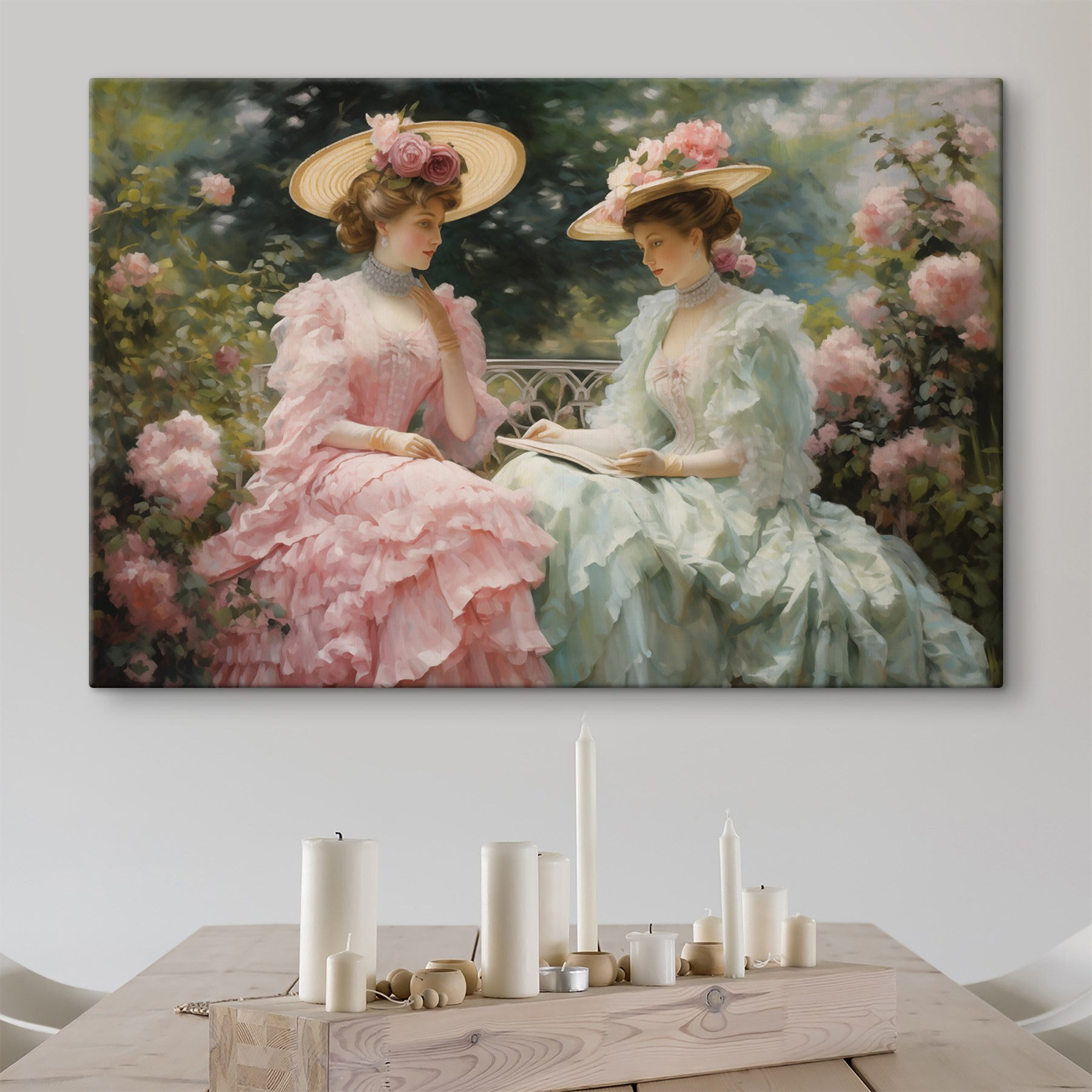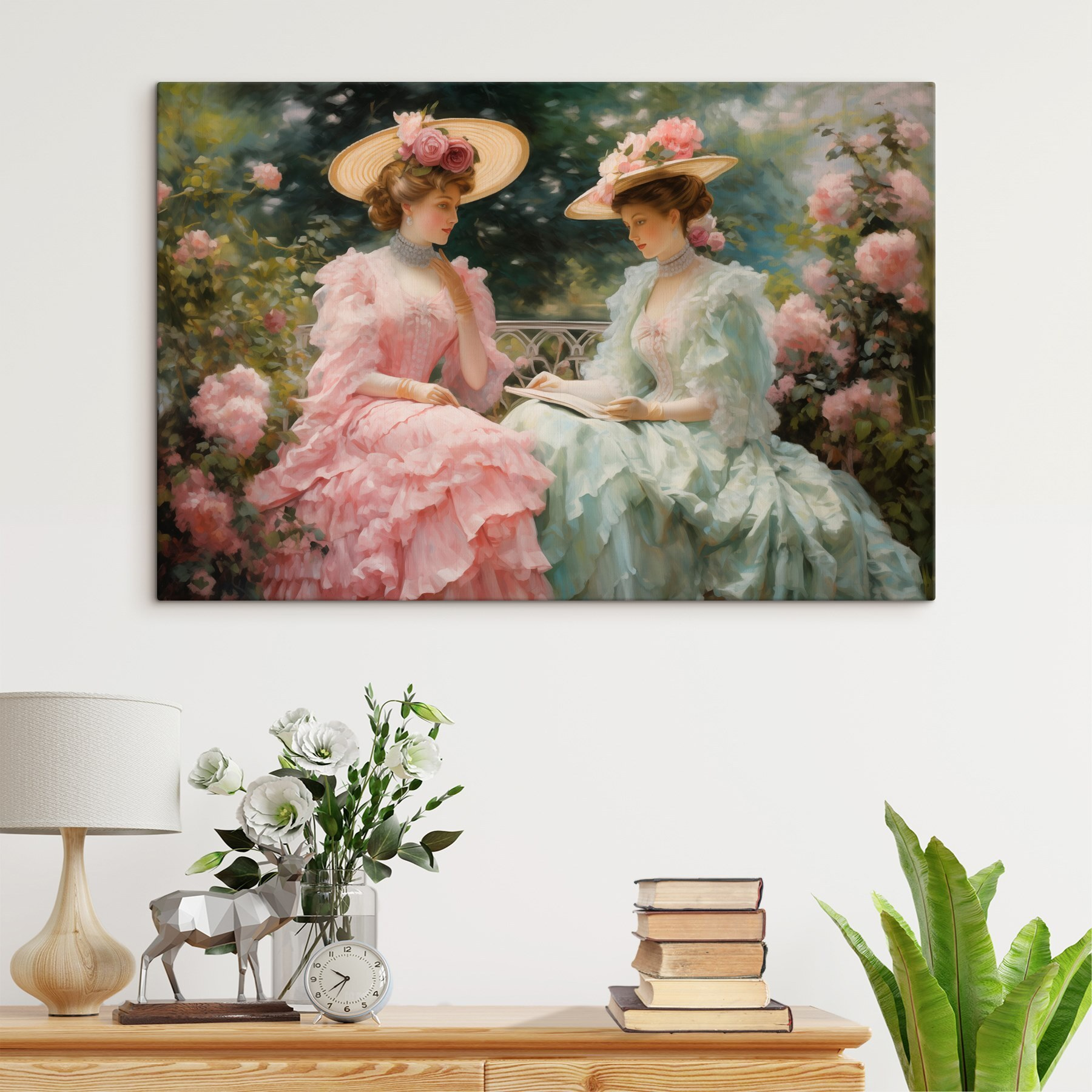 Wkrocz do świata elegancji dzięki temu wspaniałemu obrazowi na płótnie przedstawiającemu dwie kobiety w pięknych sukniach i obszernych kapeluszach. Wyobraź sobie delikatny szelest ich sukni, gdy siedzą pośród kwitnących róż, zanurzone w chwili ponadczasowego wdzięku. Ta grafika wnosi odrobinę uroku vintage i powiew świeżości do każdej przestrzeni. To jak zaproszenie wiosennego ogrodu do swojego domu! Idealna do rozjaśnienia salonu lub dodania uroku przytulnemu kącikowi do czytania, ta grafika szepcze historie o spokojnych popołudniach i piknikach w słońcu. Przygotuj się na komplementy, które popłyną jak słodka herbata na letnim spotkaniu!
