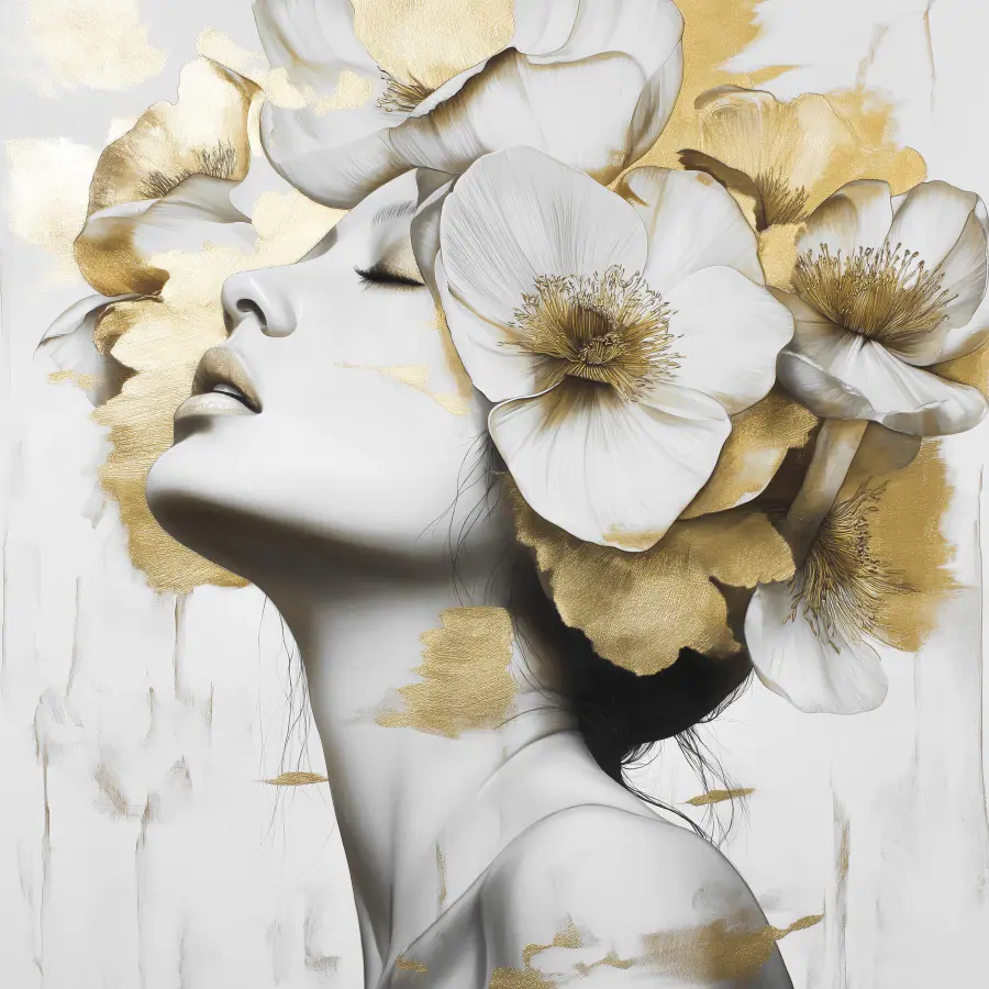 Przekształć dowolny pokój w spokojną ucieczkę dzięki temu czarującemu drukowi na płótnie przedstawiającemu kobietę ozdobioną kwiatami we włosach. Wyobraź sobie ścianę, która szepcze spokojnie, zachęcając do uśmiechu i poczucia spokoju. Świeże kwiaty i wdzięczne linie tworzą atmosferę, która jest zarówno elegancka, jak i nieco zabawna. Wyobraź sobie, że przechodzisz obok i rzucasz okiem – tylko tyle, by na chwilę zatrzymać się i odetchnąć. To jak posiadanie ogrodu, który kwitnie przez cały rok, bez konieczności podlewania. Idealny do przytulnych przestrzeni lub kolekcji sztuki potrzebującej odrobiny kaprysu, ten element dodaje osobowości bez zamieszania. Urocze przypomnienie, aby objąć piękno w codziennych chwilach.