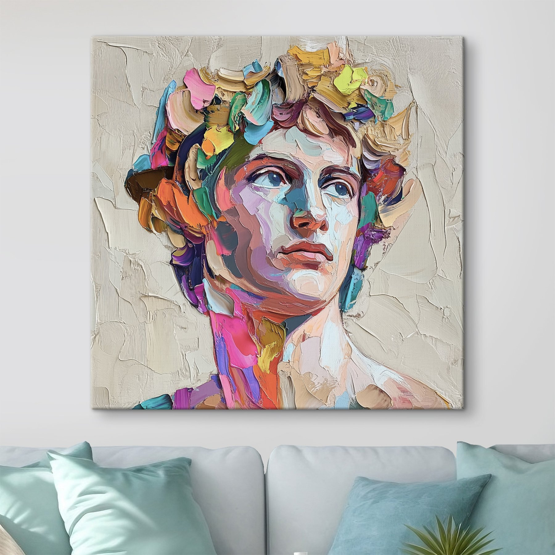 To dzieło oddaje nie tylko twarz, ale także uczucie – ciekawość, a może nawet nutkę psoty. Zachęca do uśmiechu, podziwu, krótkiej ucieczki do świata, w którym kolory mówią głośniej niż słowa. Idealny do salonu, biura lub tego przytulnego zakątka, którego jeszcze nie wystylizowałeś. To sztuka z przymrużeniem oka, gotowa ożywić każdy kąt, a kto nie kocha odrobiny dodatkowego polotu?
