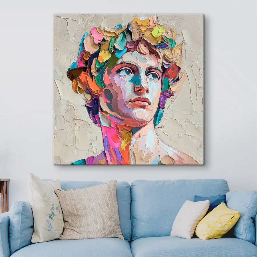 Wyobraź sobie ten żywy wydruk na płótnie, który stanie się wyrazem Twojej przestrzeni – to jak odrobina osobowości opakowana w kolor! To dzieło, przedstawiające głowę mężczyzny, to nie tylko sztuka; to początek rozmowy. Barwy tańczą razem, wciągając cię swoim zabawnym duchem. Wyobraź sobie gości przyciągniętych do niego, dzielących się historiami o swoich ulubionych artystach lub czasach, kiedy próbowali malować (i skończyli z większą ilością farby na sobie niż na płótnie).