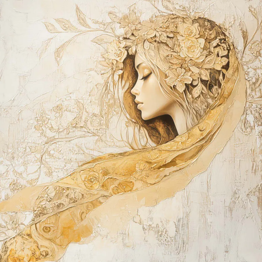 Odmień każdą przestrzeń dzięki temu oszałamiającemu drukowi na płótnie przedstawiającemu kobietę ozdobioną kwiatami we włosach. To tak, jakby wyszła prosto z sennego ogrodu i zamieszkała w Twoim domu. Miękkie, ziemiste odcienie tworzą uspokajającą atmosferę, dzięki czemu idealnie nadaje się do przytulnego kącika lub jako element dekoracyjny w salonie. Wyobraź sobie, że popijasz herbatę i czujesz ciepło otaczającej Cię natury. To prawie tak, jakby szeptała tajemnice wszechświata. Podnieś swój wystrój i dodaj odrobinę kaprysu – bo kto nie chciałby mieć nad sobą kwiatowego przyjaciela?