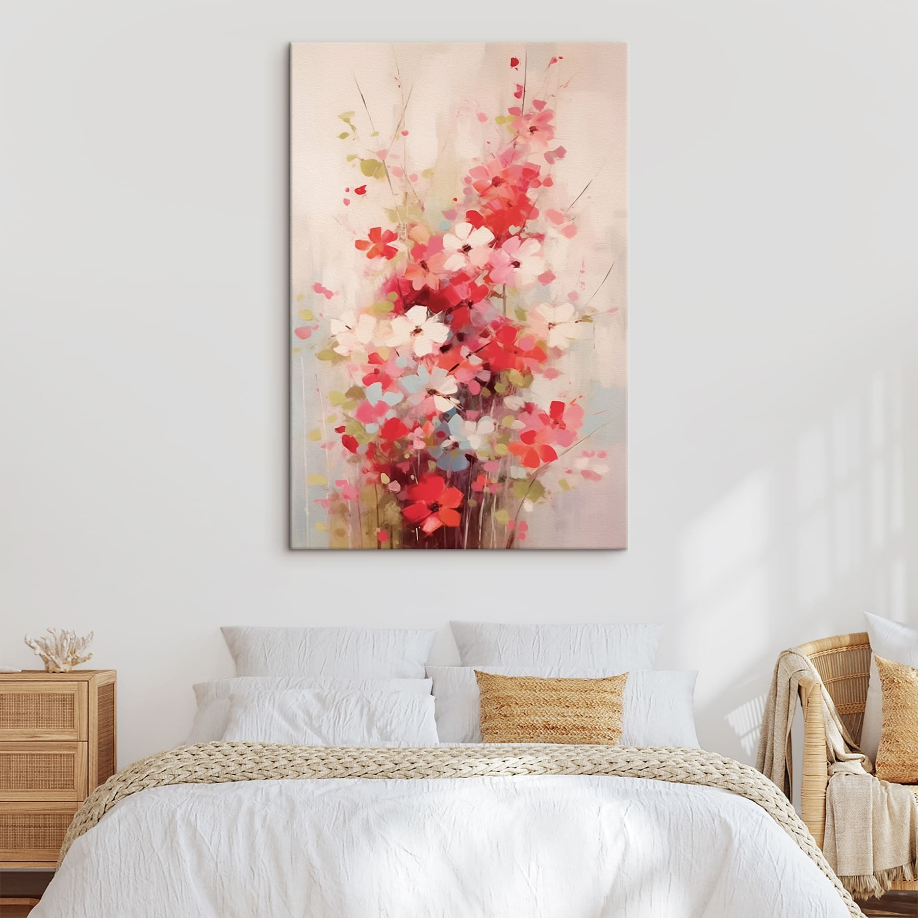 Rozjaśnij każde pomieszczenie dzięki temu wesołemu obrazowi na płótnie przedstawiającemu kwiaty w wazonie. Wyobraź sobie, że wchodzisz do swojego pokoju i witają Cię plamy kolorów, figlarne czerwienie i delikatne biele, które wydają się kołysać z radości. To tak, jakbyś miał wiosnę uwięzioną na ścianie, przypominającą o słonecznych popołudniach i delikatnej bryzie. Idealny na te dni, kiedy potrzebujesz odrobiny orzeźwienia lub po prostu iskry natury we wnętrzu. Powieś ją w swoim salonie i obserwuj, jak twarze gości się rozjaśniają. Kto by pomyślał, że nadruk może podnieść nastrój tak bez wysiłku? Udekoruj swoją ścianę tą kwiatową rozkoszą i pozwól rozkwitnąć pięknu.