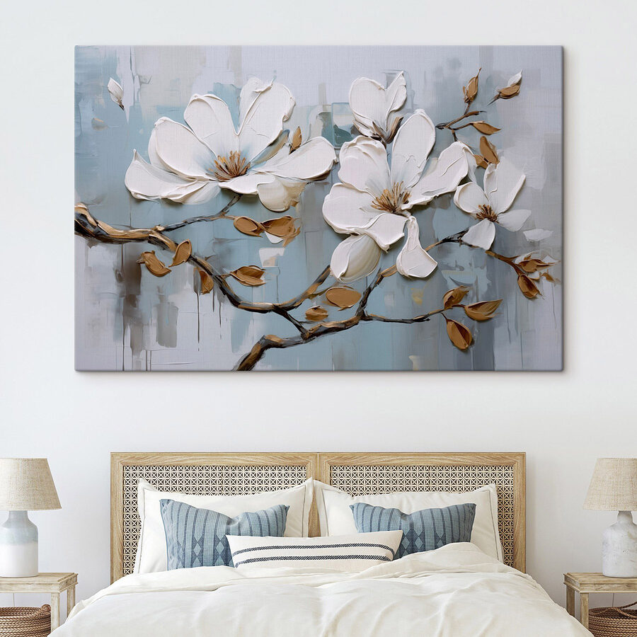 Odmień swoją przestrzeń dzięki temu wspaniałemu obrazowi na płótnie przedstawiającemu delikatne białe kwiaty na gałęzi. Wyobraź sobie, że wchodzisz do pokoju, w którym spokojne kwiaty zapraszają do wyciszenia, szepcząc opowieści o pięknie natury. Delikatne odcienie wprowadzają orzeźwiający nastrój – idealny do rozjaśnienia ponurych dni lub po prostu dodania odrobiny elegancji. Wyobraź sobie tę grafikę nad przytulną kanapą, zachęcającą do ciepłych rozmów lub inspirującą do spokojnych chwil przy filiżance herbaty. To jak przeniesienie ogrodu do domu bez konieczności podlewania! Przewiduj te “ochy” i “achy” od przyjaciół. Wspaniały dodatek dla miłośników kwiatów!